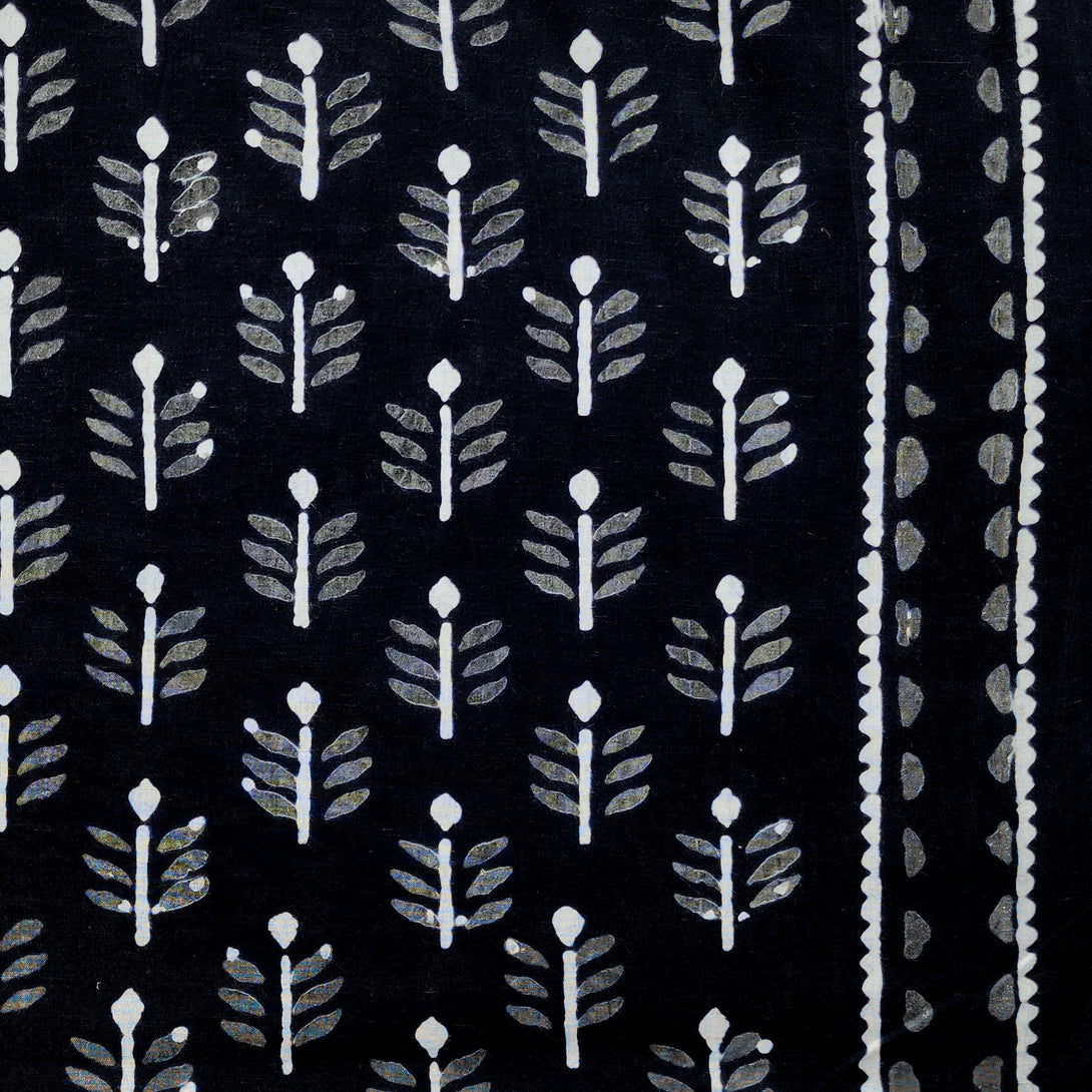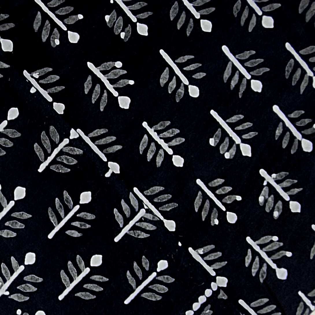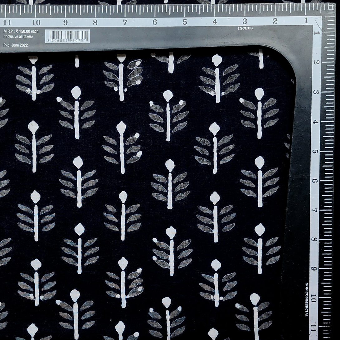 Pure Cotton Black With White Grey Leafs Motifs With Border Hand Block Print Fabric