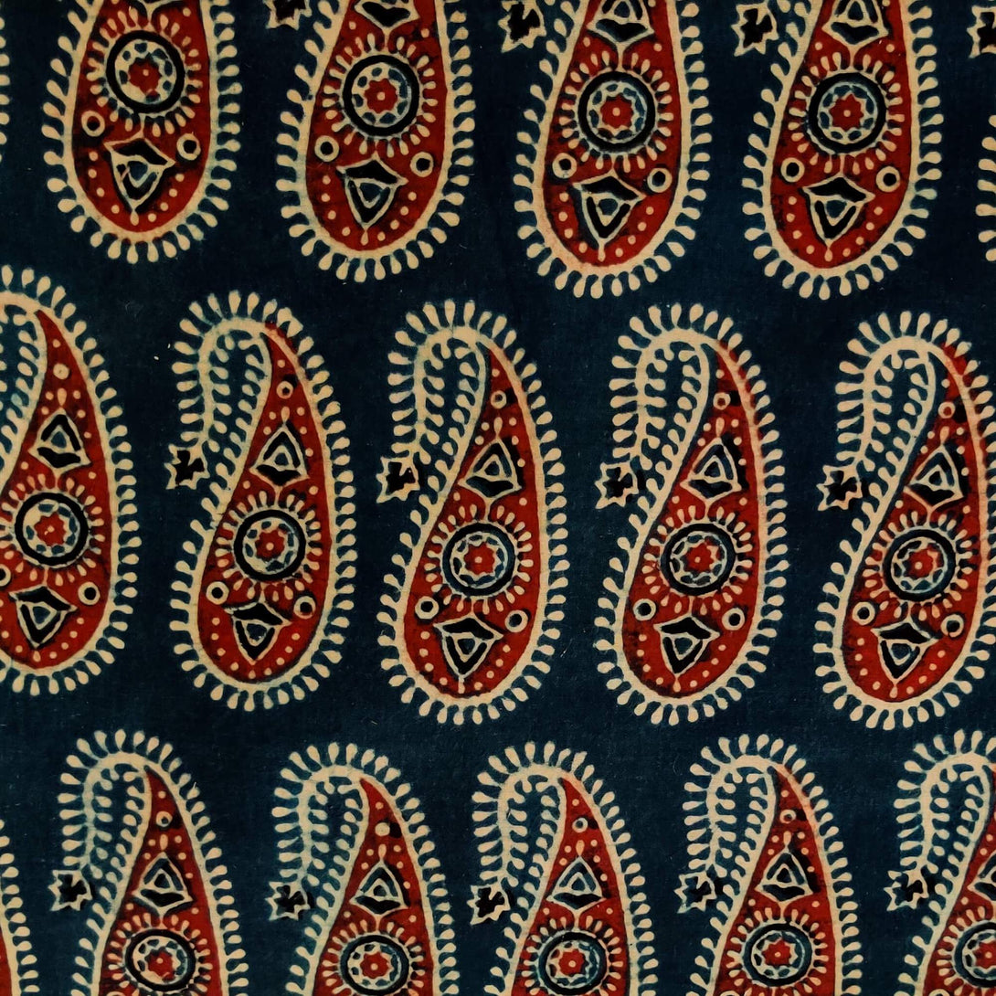Pure Cotton Blue Ajrak With Rust Intricate Kairi Hand Block Print Blouse Fabric ( 95 CM )