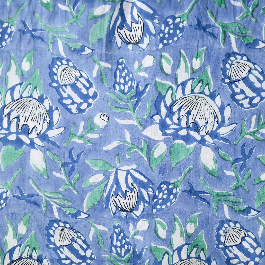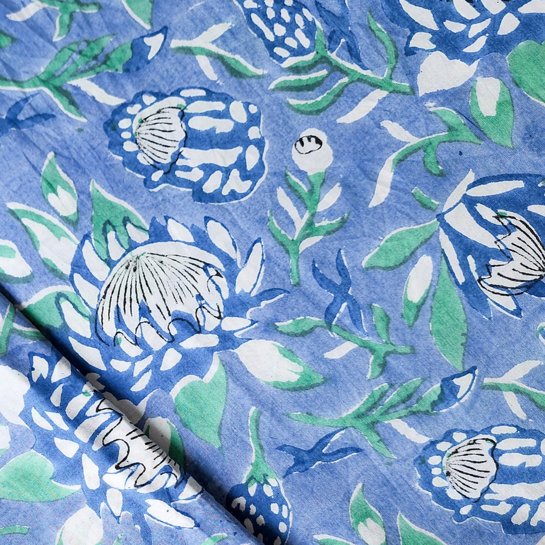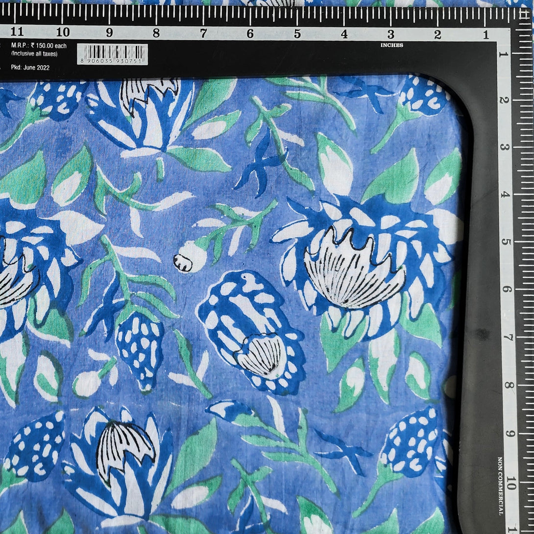 Pure Cotton Blue With Green Flower Jaal Hand Block Print Fabric