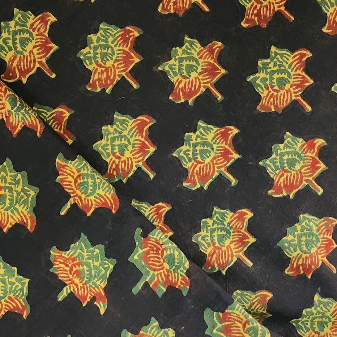 Pure Cotton Double Ajrak Black With Green And Rust Flower Hand Block Print Fabric