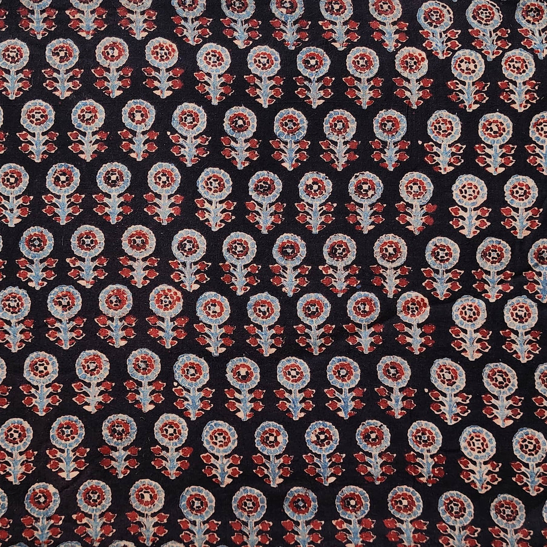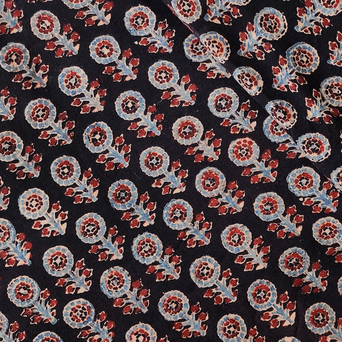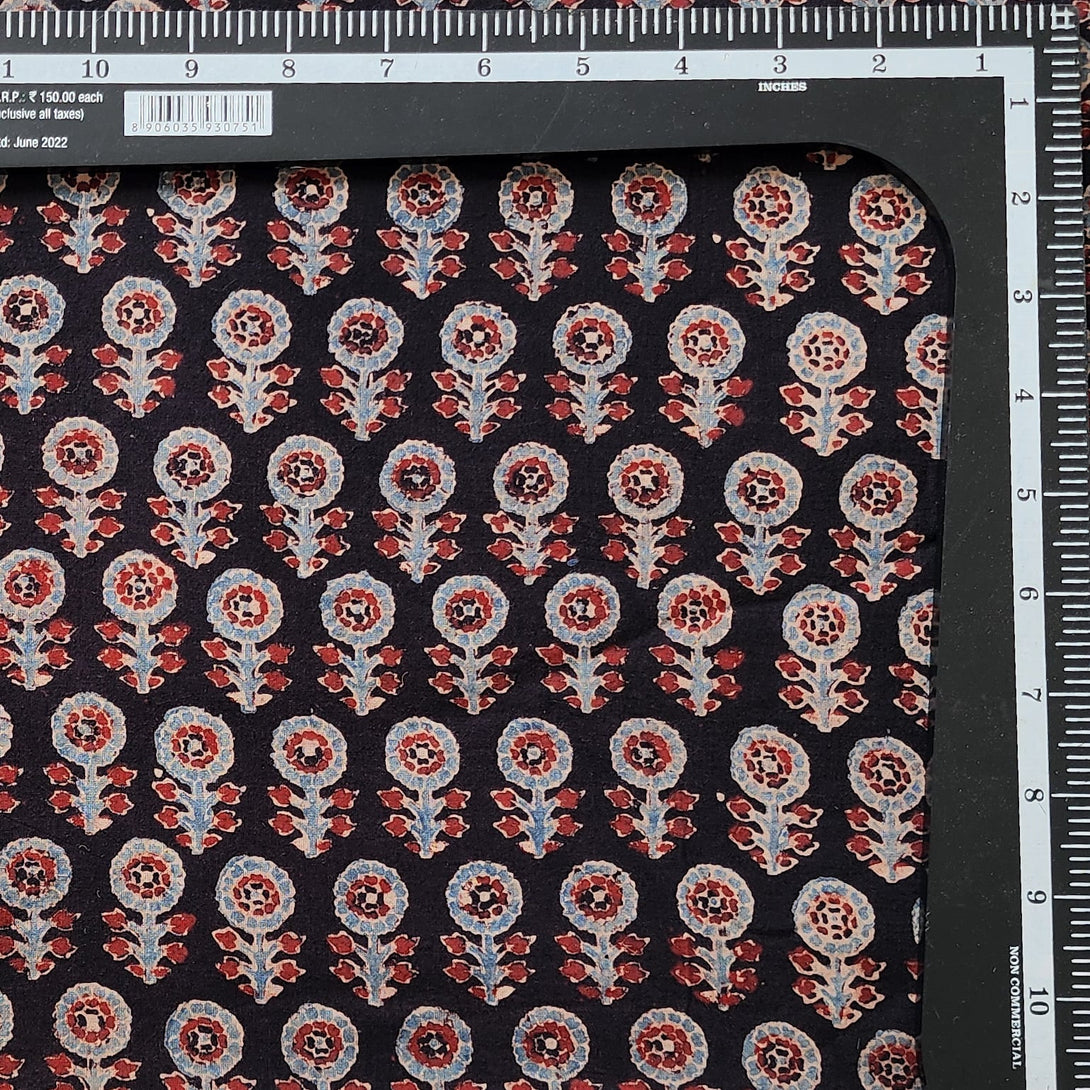 Pure Cotton Double Ajrak Black With Red Flower Motif Hand Block Print Fabric