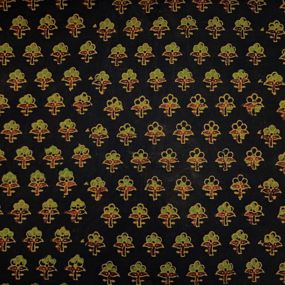 Pure Cotton Double Ajrak Brown With Green Rust Tiny Flowers Hand Block Print Fabric