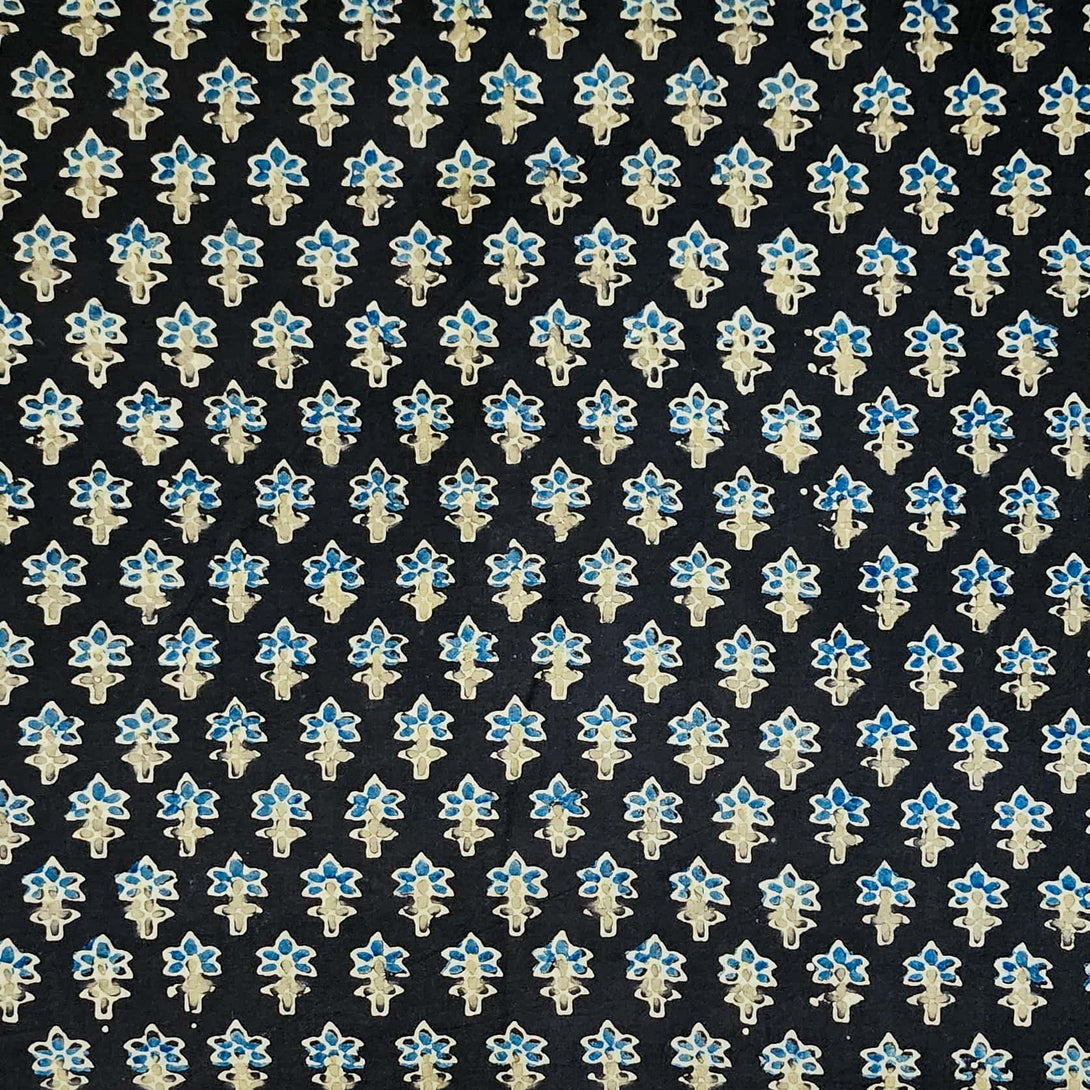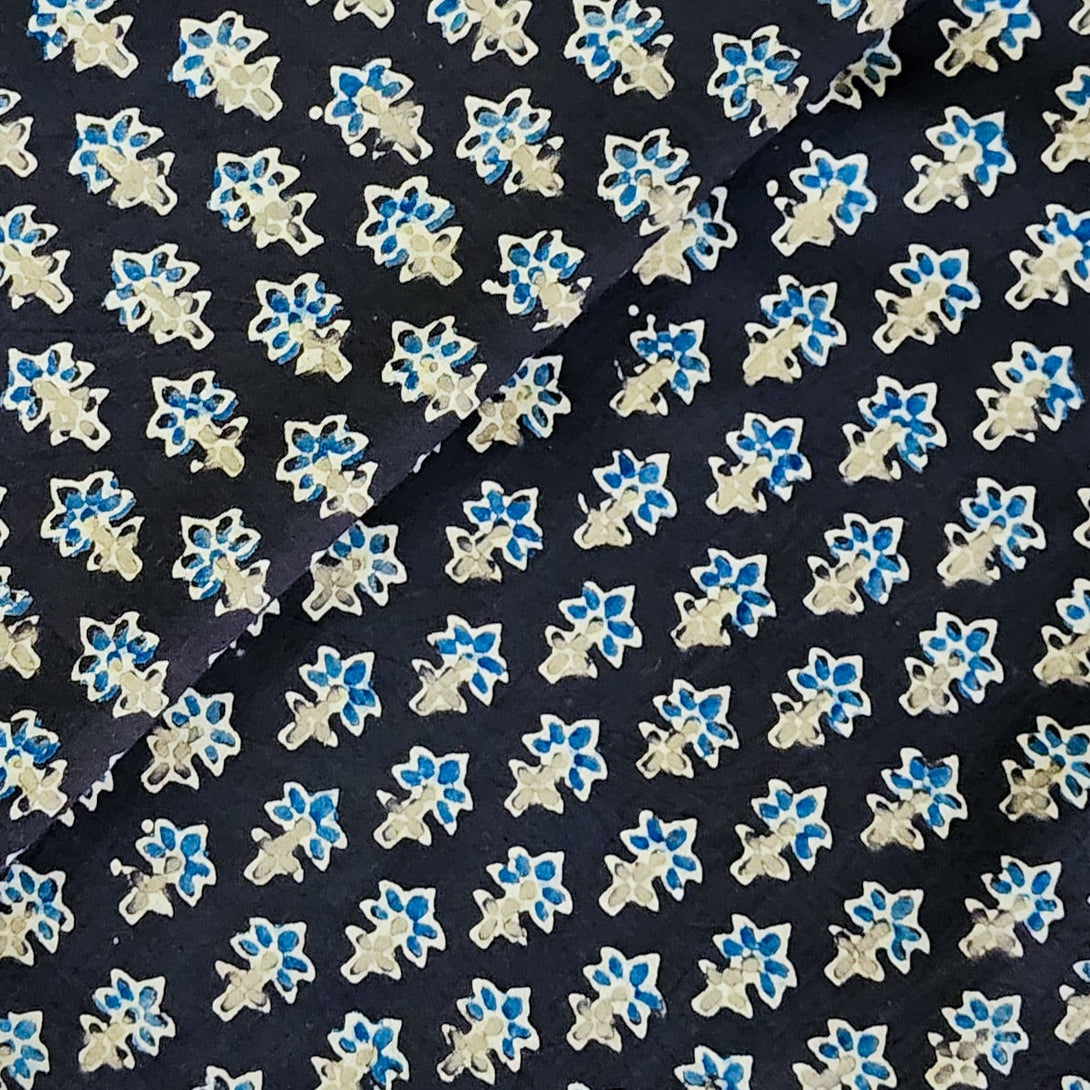 Pure Cotton Double Ajrak Brown With Light Blue Tiny Plant Bud Hand Block Print Fabric