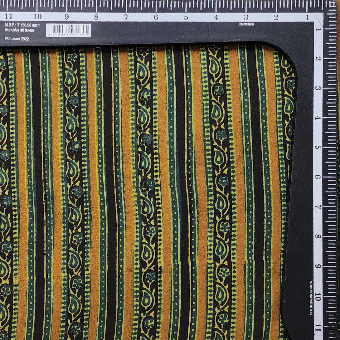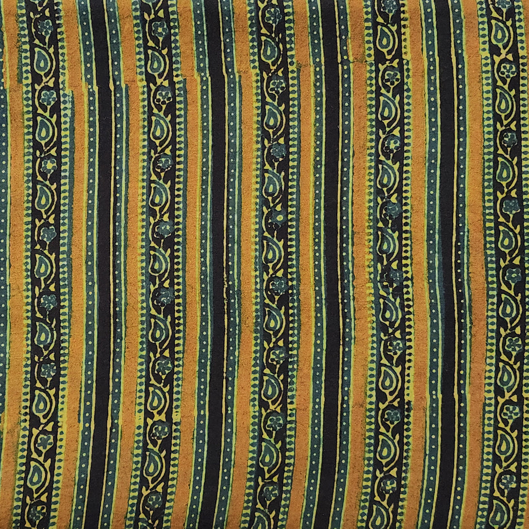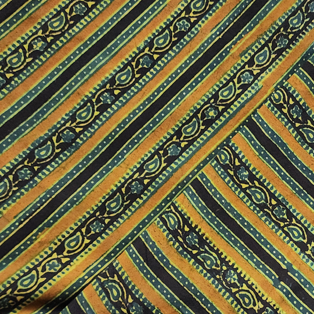 Pure Cotton Double Ajrak Green With Yellow Border Intricate Design Hand Block Print Fabric