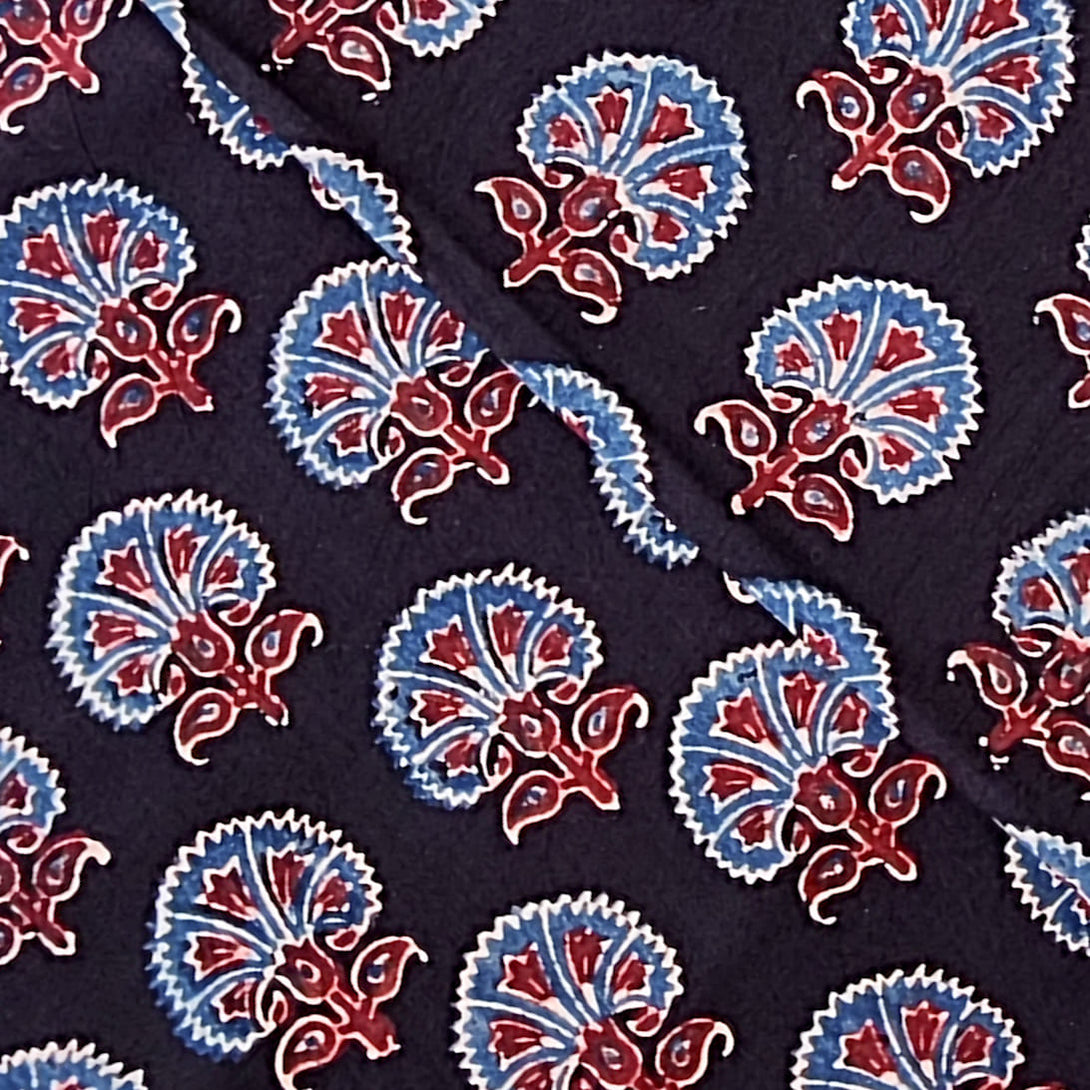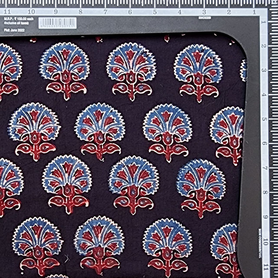 Pure Cotton Gad Ajrak Black With Blue And Maroon Flower Motif Hand Block Print Fabric