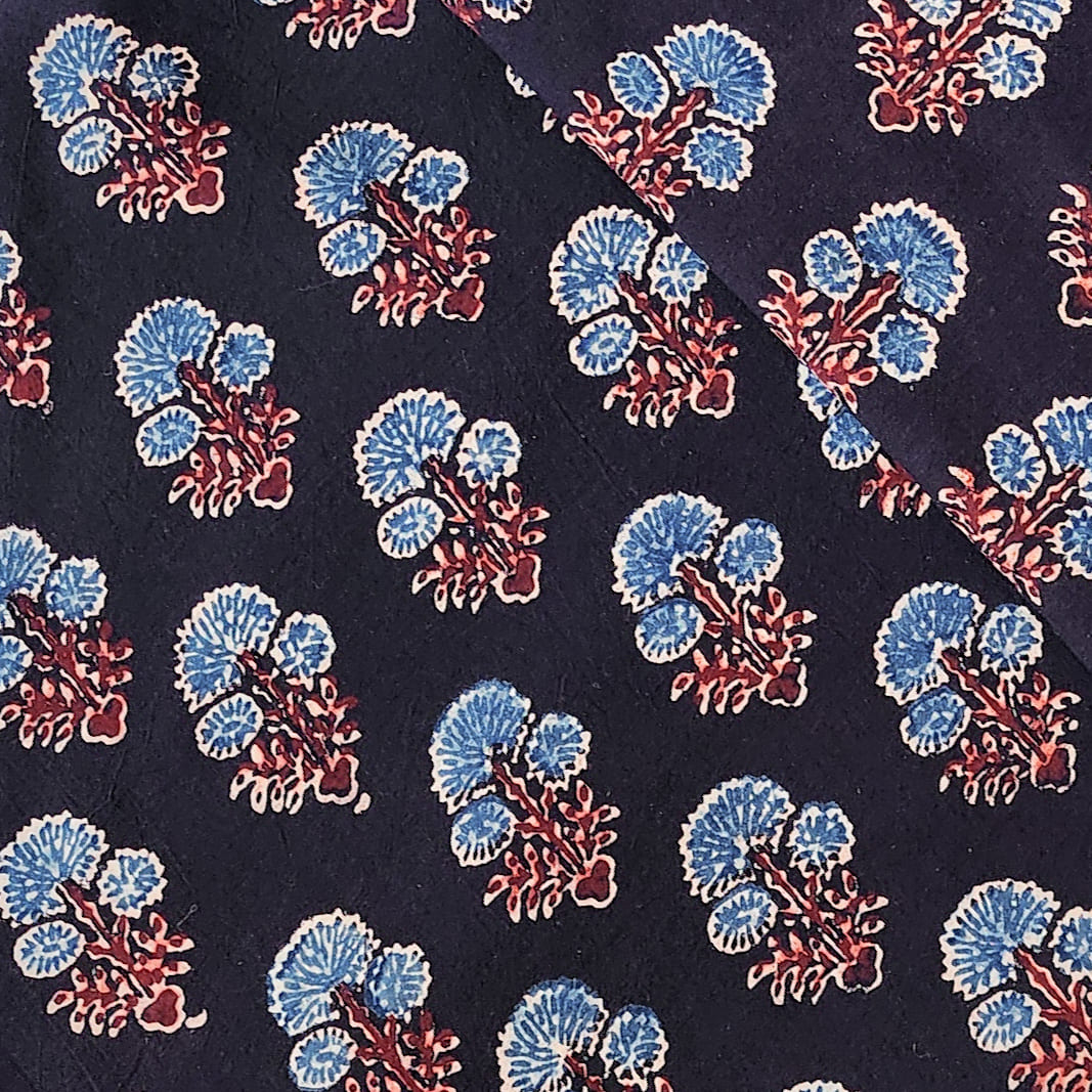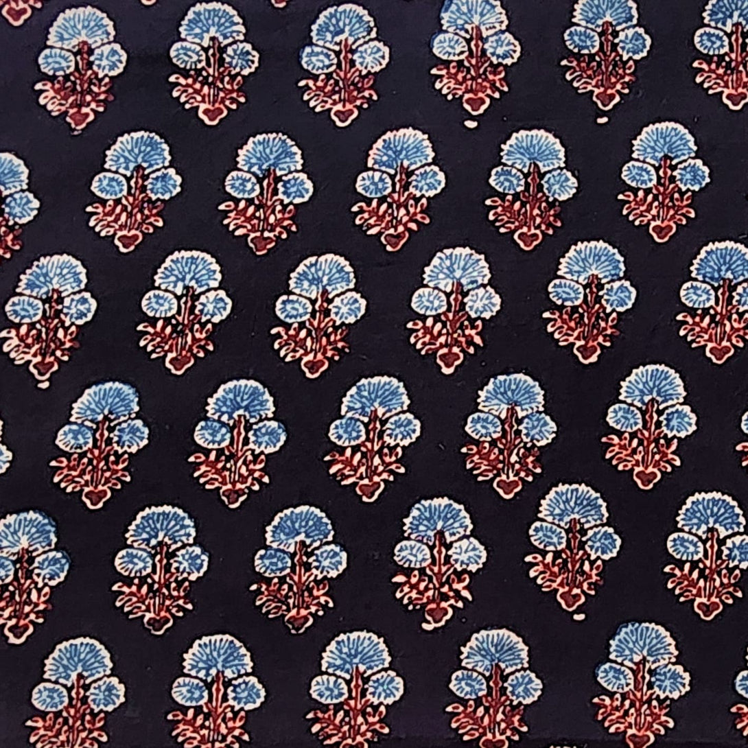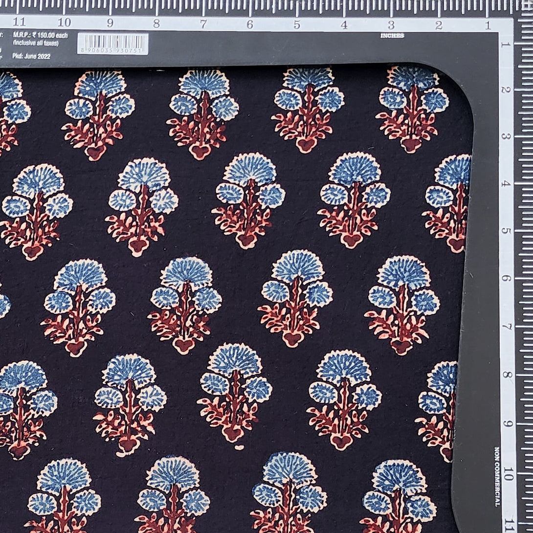Pure Cotton Gad Ajrak Black With Blue And Maroon Flower Motif Hand Block Print Fabric