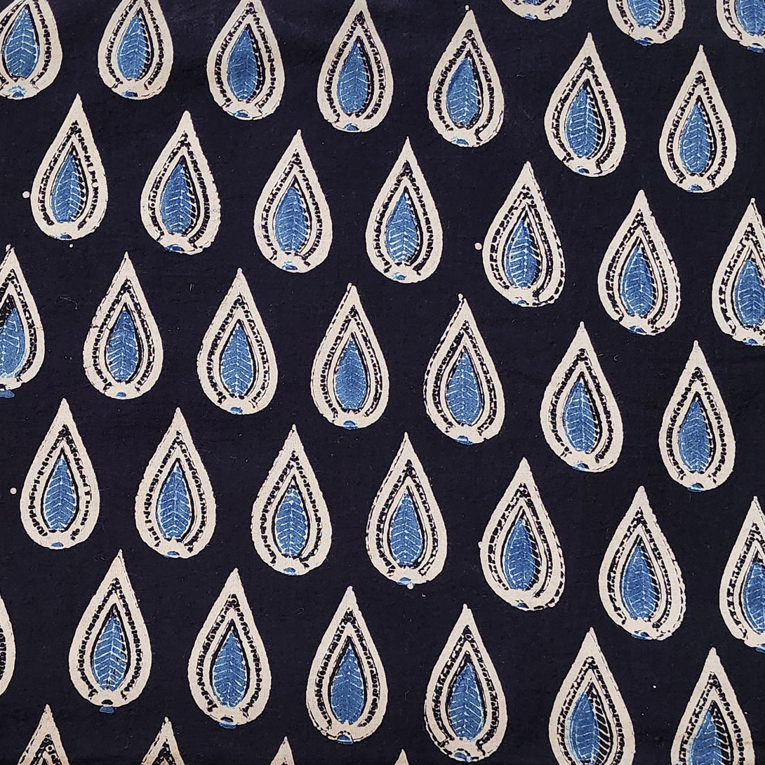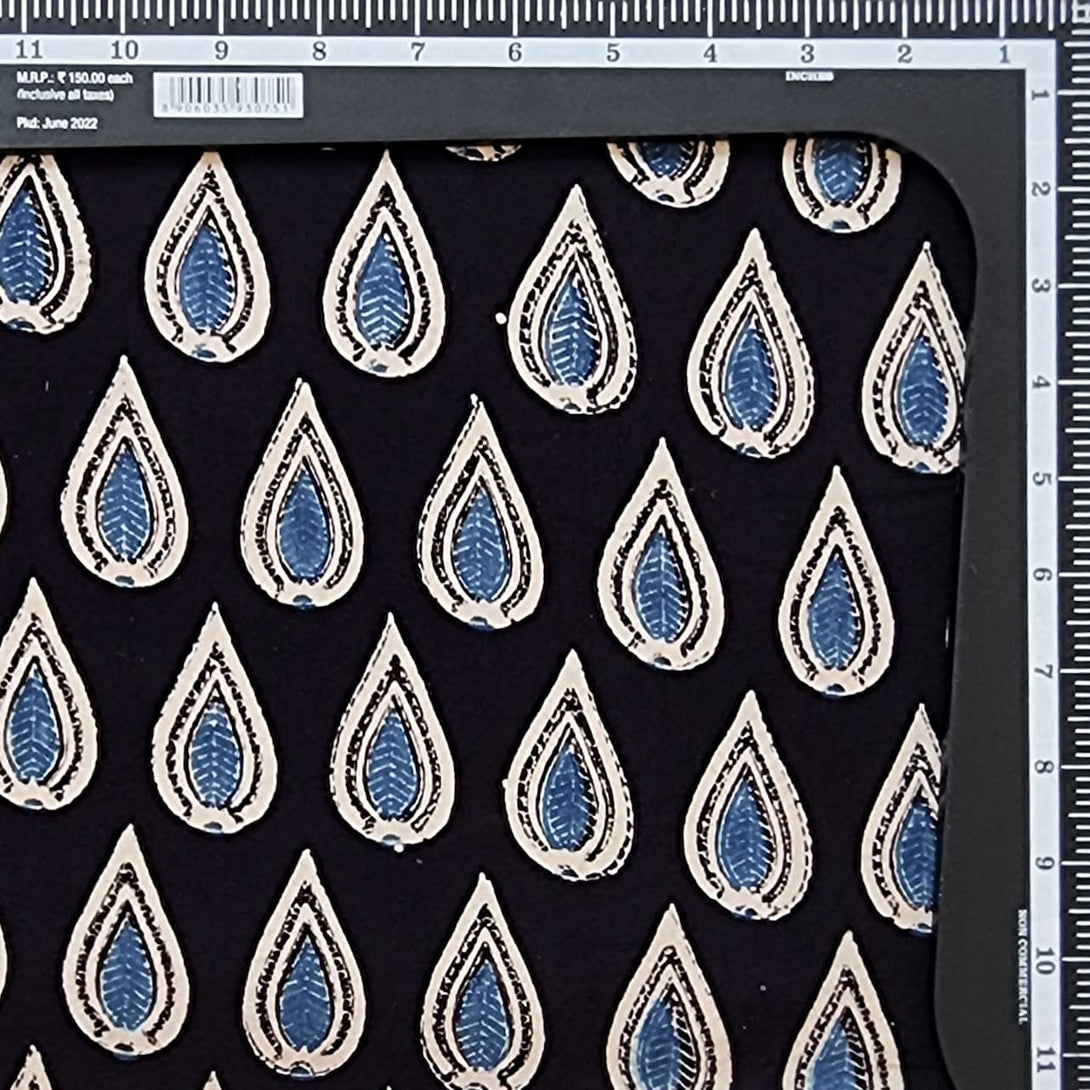 Pure Cotton Gad Ajrak Black With Blue And Off White Leaves Motif Hand Block Print Fabric