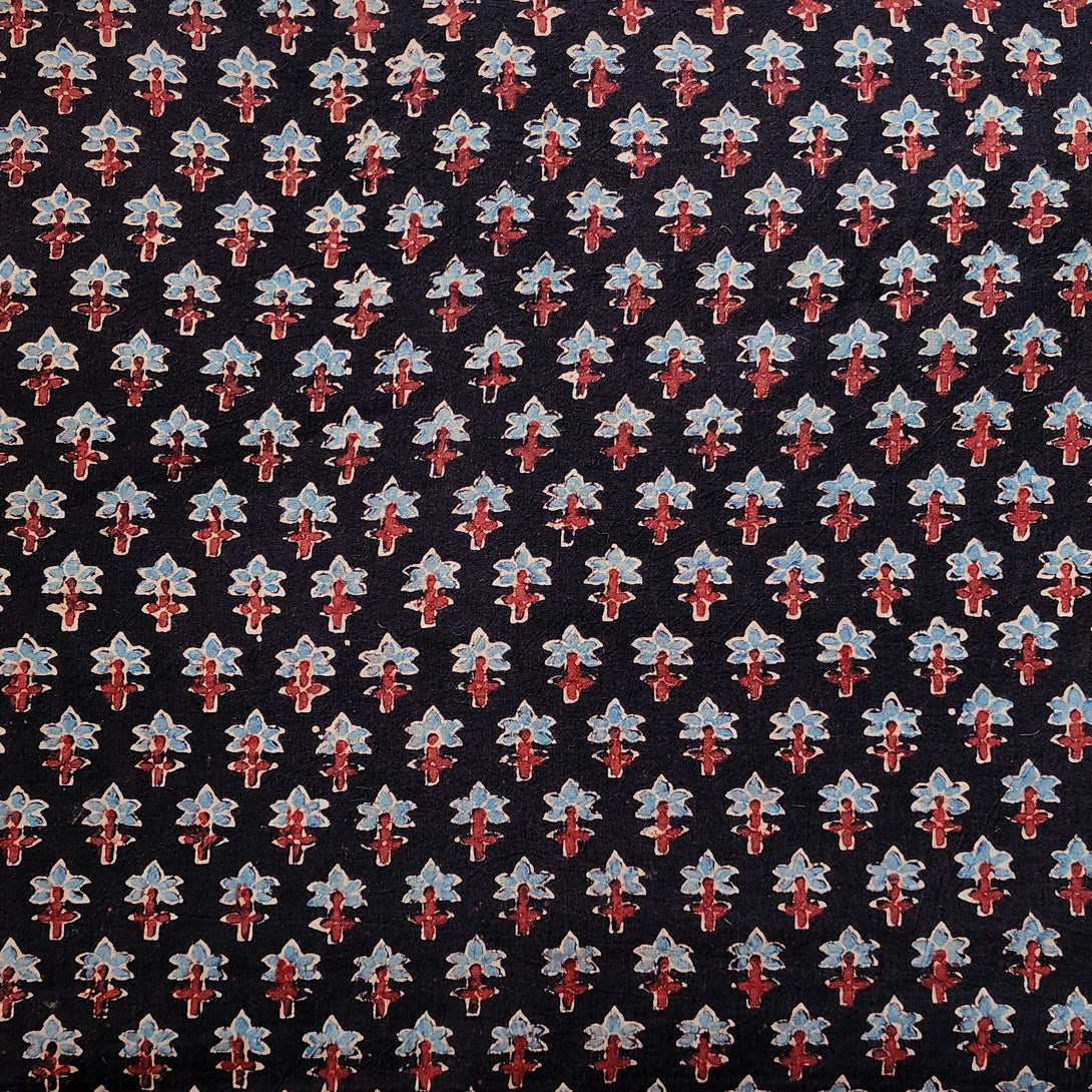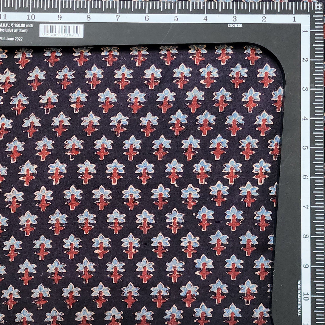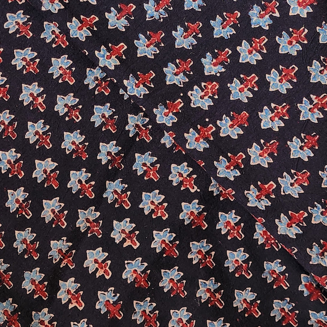 Pure Cotton Gad Ajrak Black With Blue And Red Tiny Flower Hand Block Print