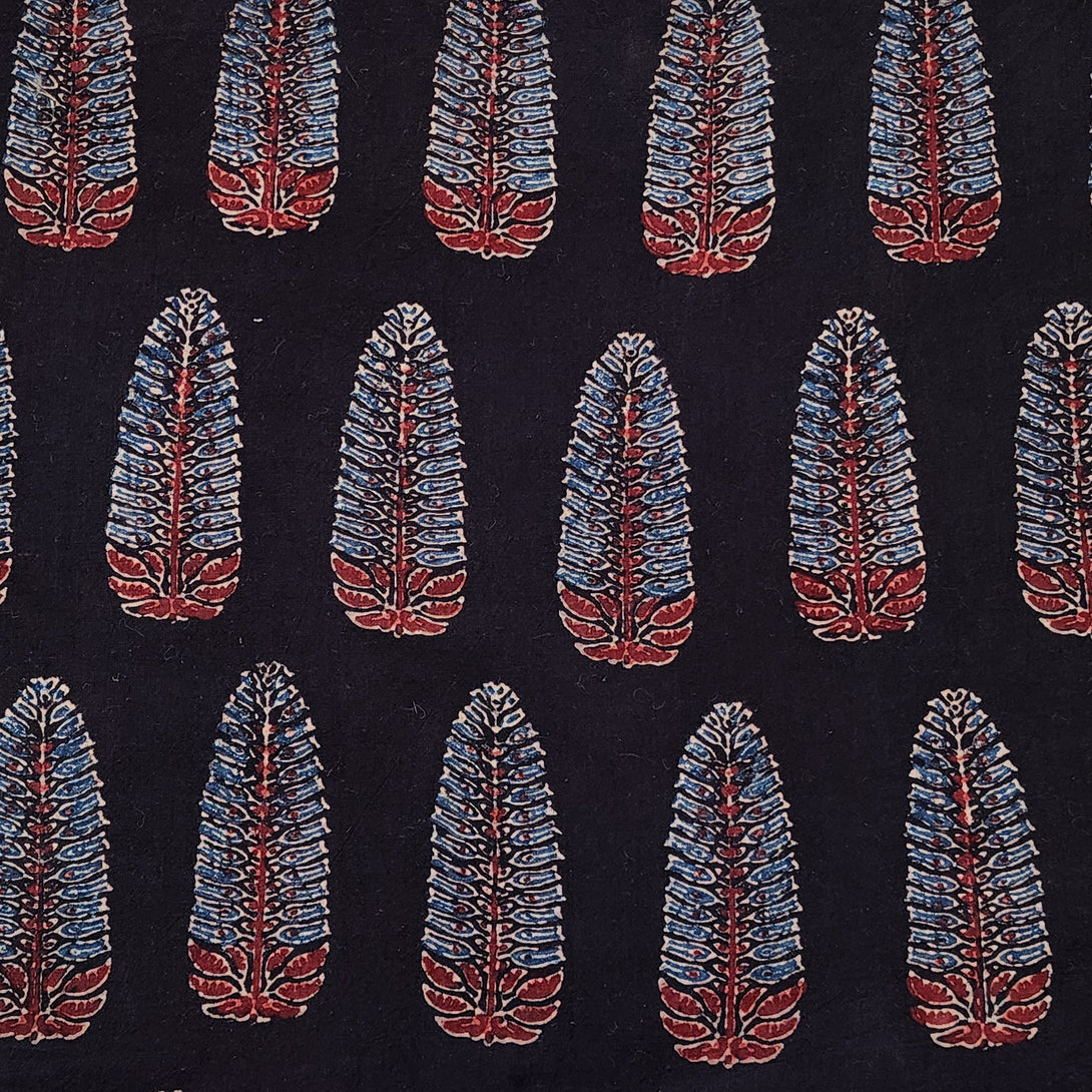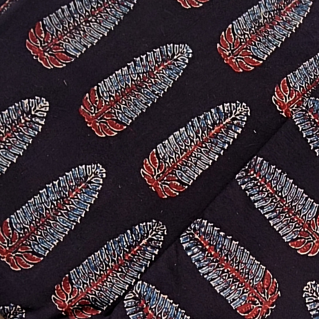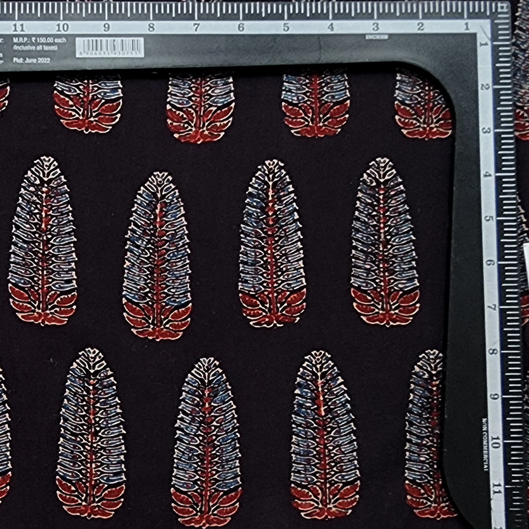 Pure Cotton Gad Ajrak Black With Blue Leaves Motif Hand Block Print Fabric