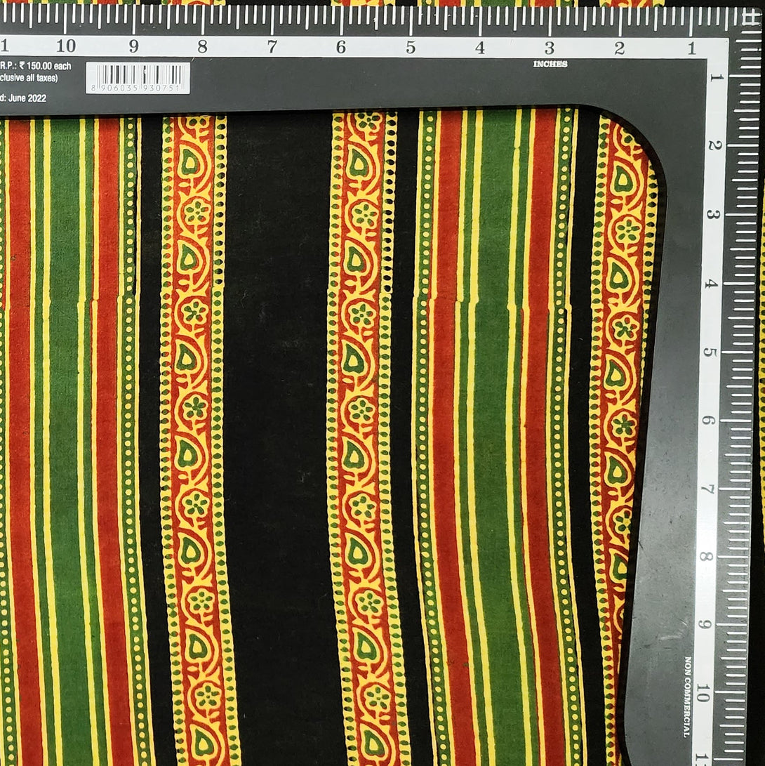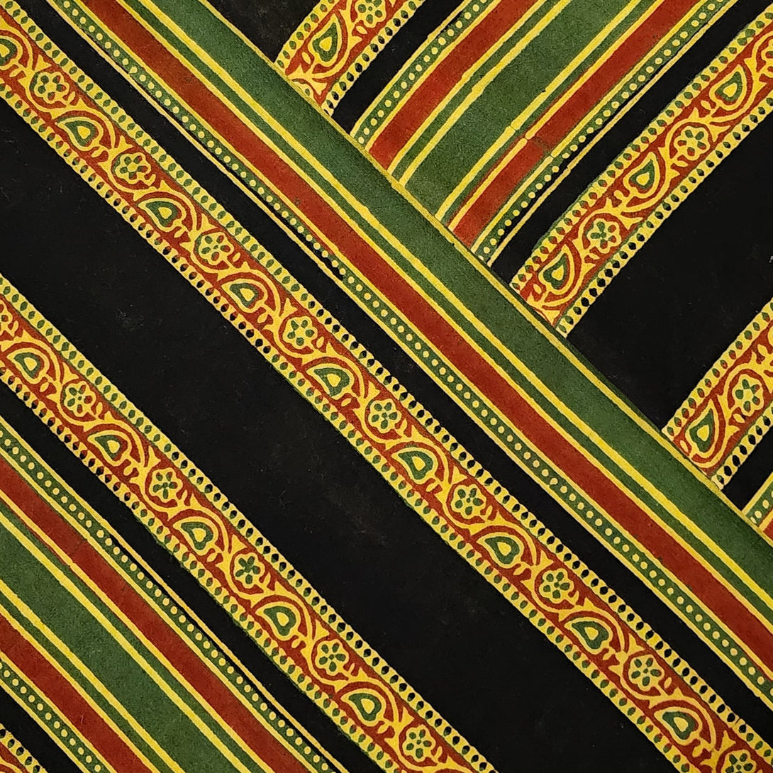 Pure Cotton Gad Ajrak Black With Red And Green Big Intricate Border Stripes Hand Block Print Fabric