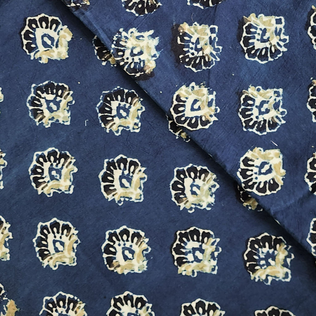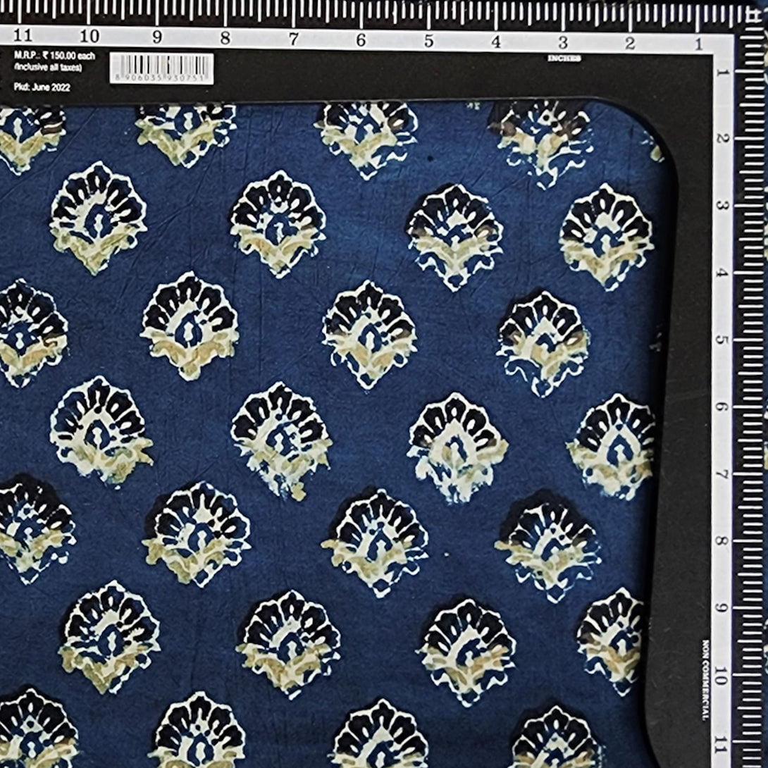 Pure Cotton Gad Ajrak Blue With Black And Green Flower Motif Hand Block Print Fabric