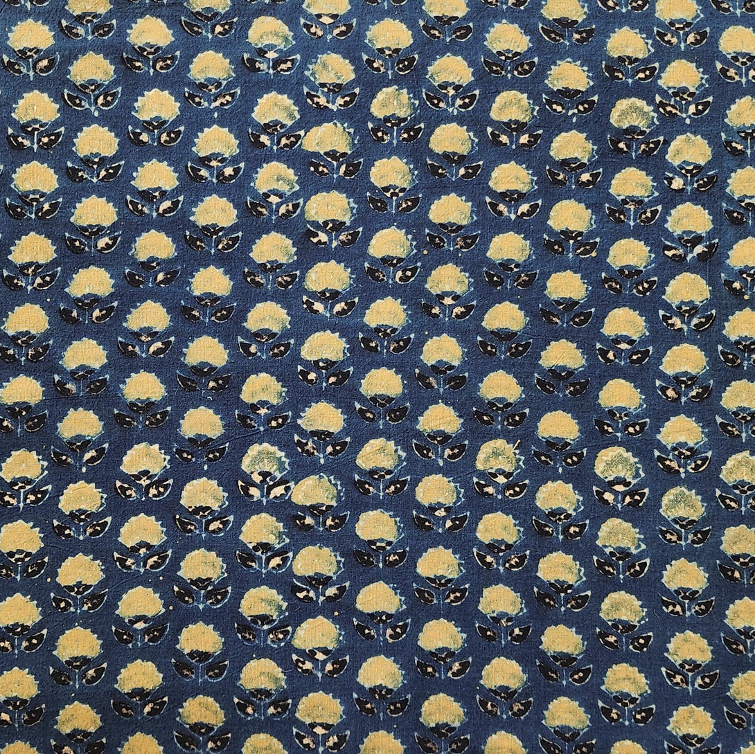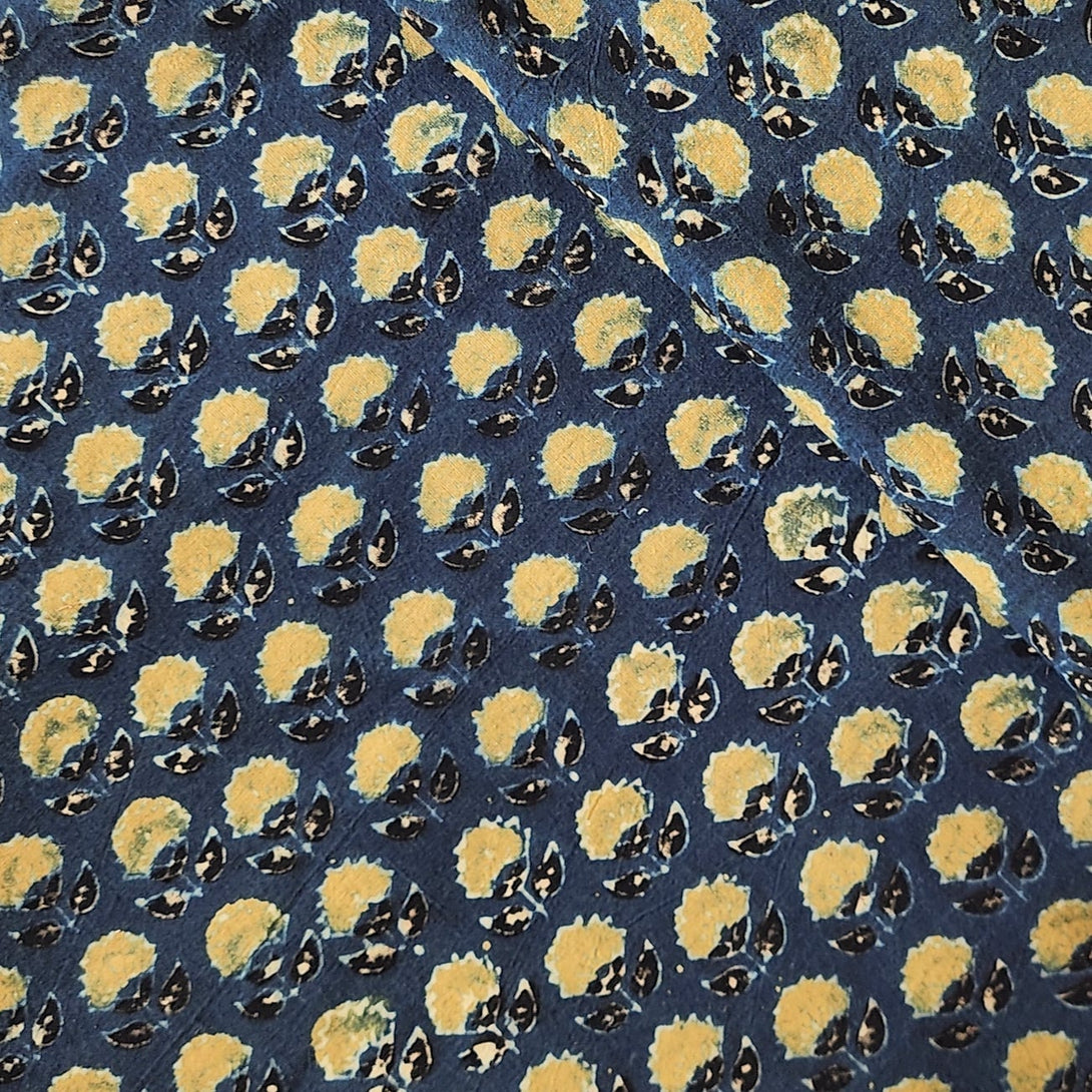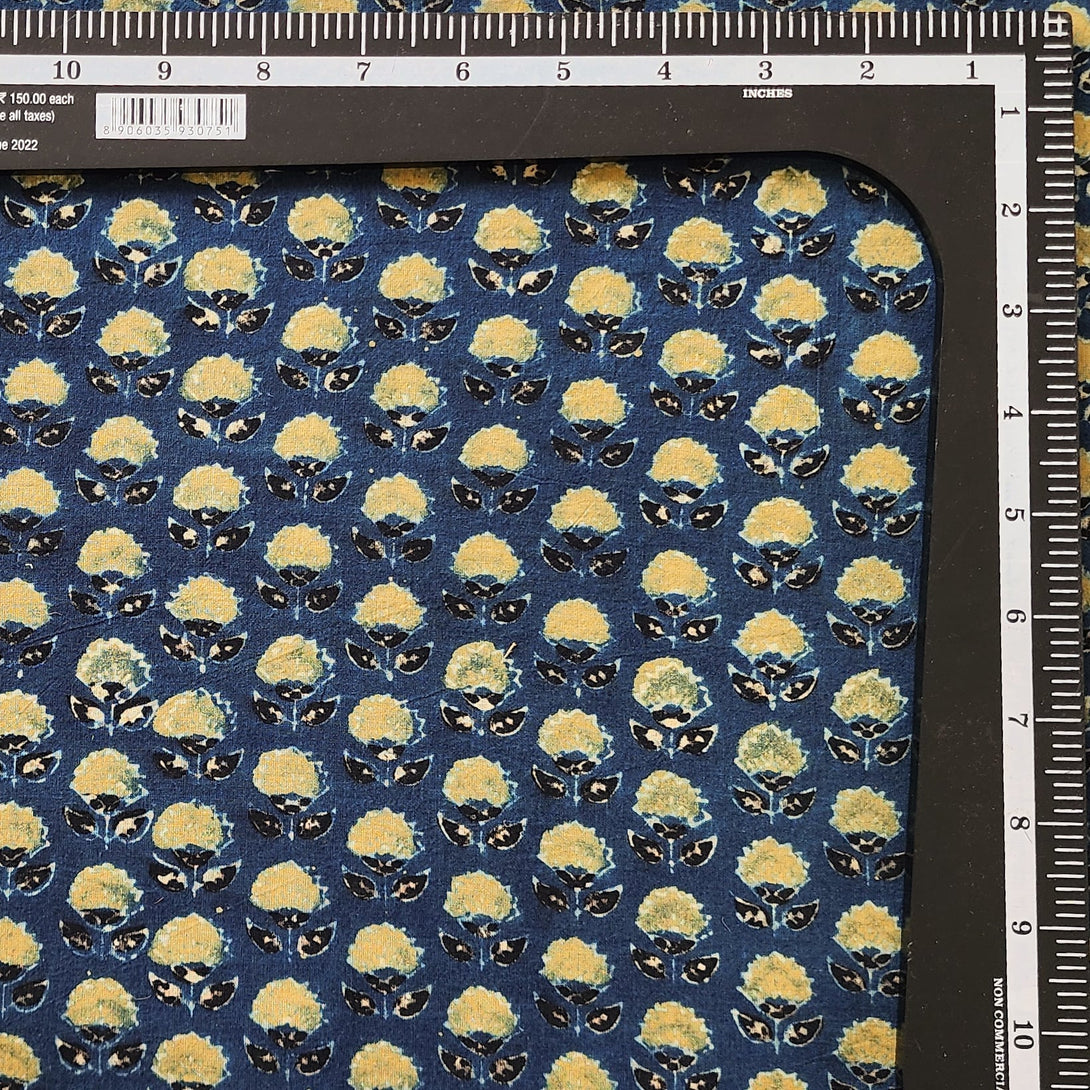 Pure Cotton Gad Ajrak Blue With Green Flower Motif Hand Block Print Fabric