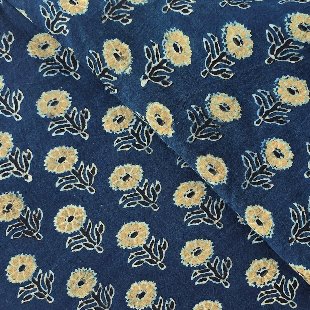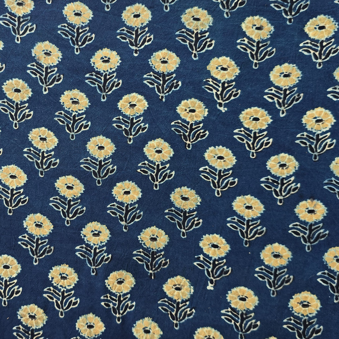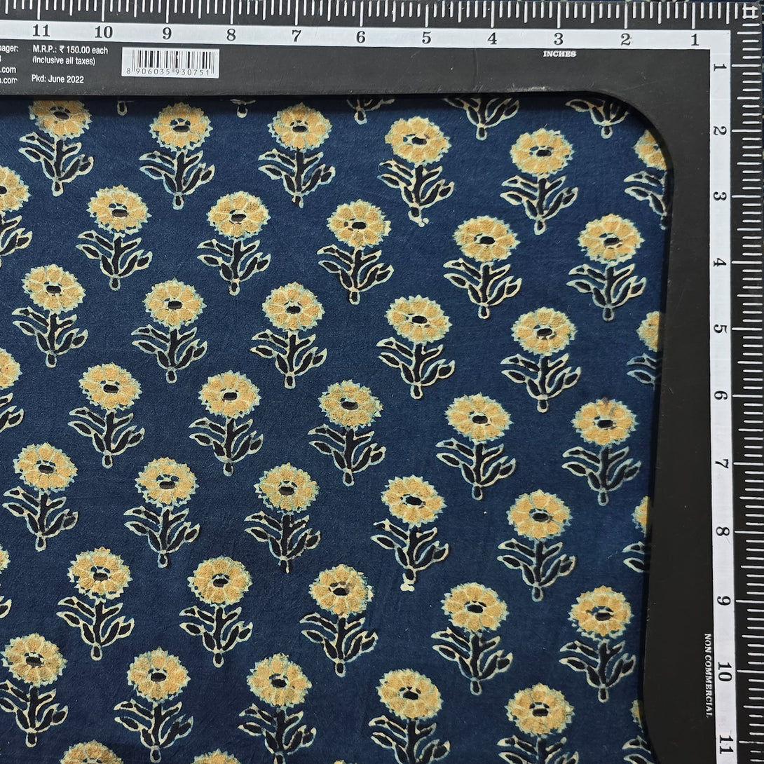 Pure Cotton Gad Ajrak Blue With Mustard Flower Motif Hand Block Print Fabric