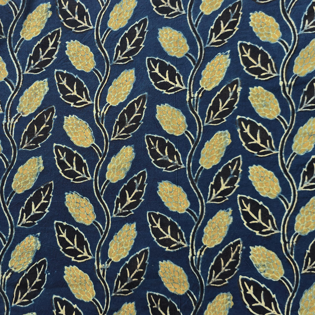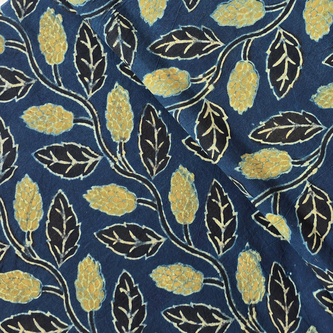 Pure Cotton Gad Ajrak Blue With Mustard Leaves Creeper Hand Block Print Fabric