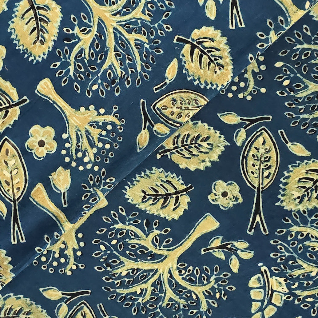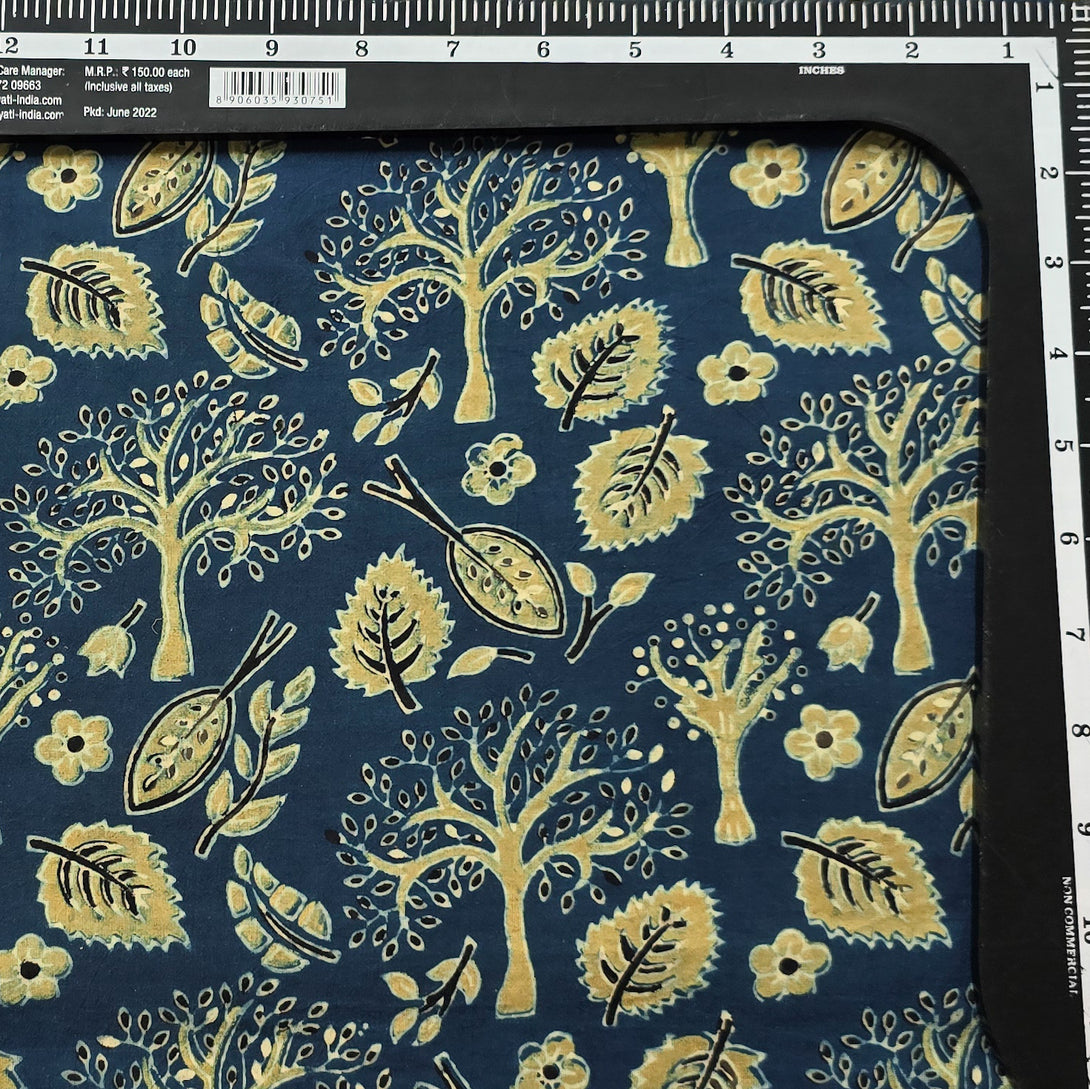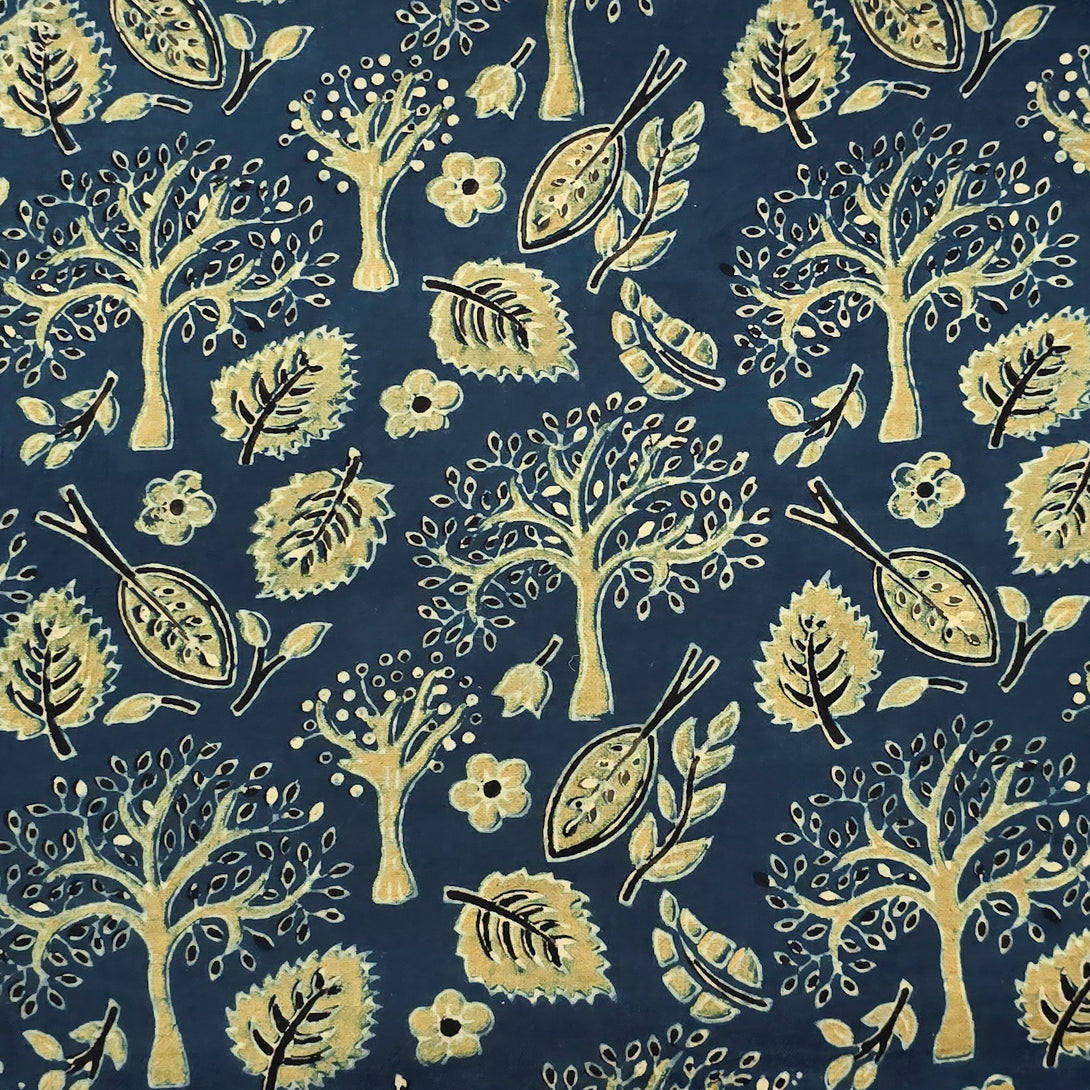 Pure Cotton Gad Ajrak Blue With Rust Green Tree Design Hand Block Print Fabric