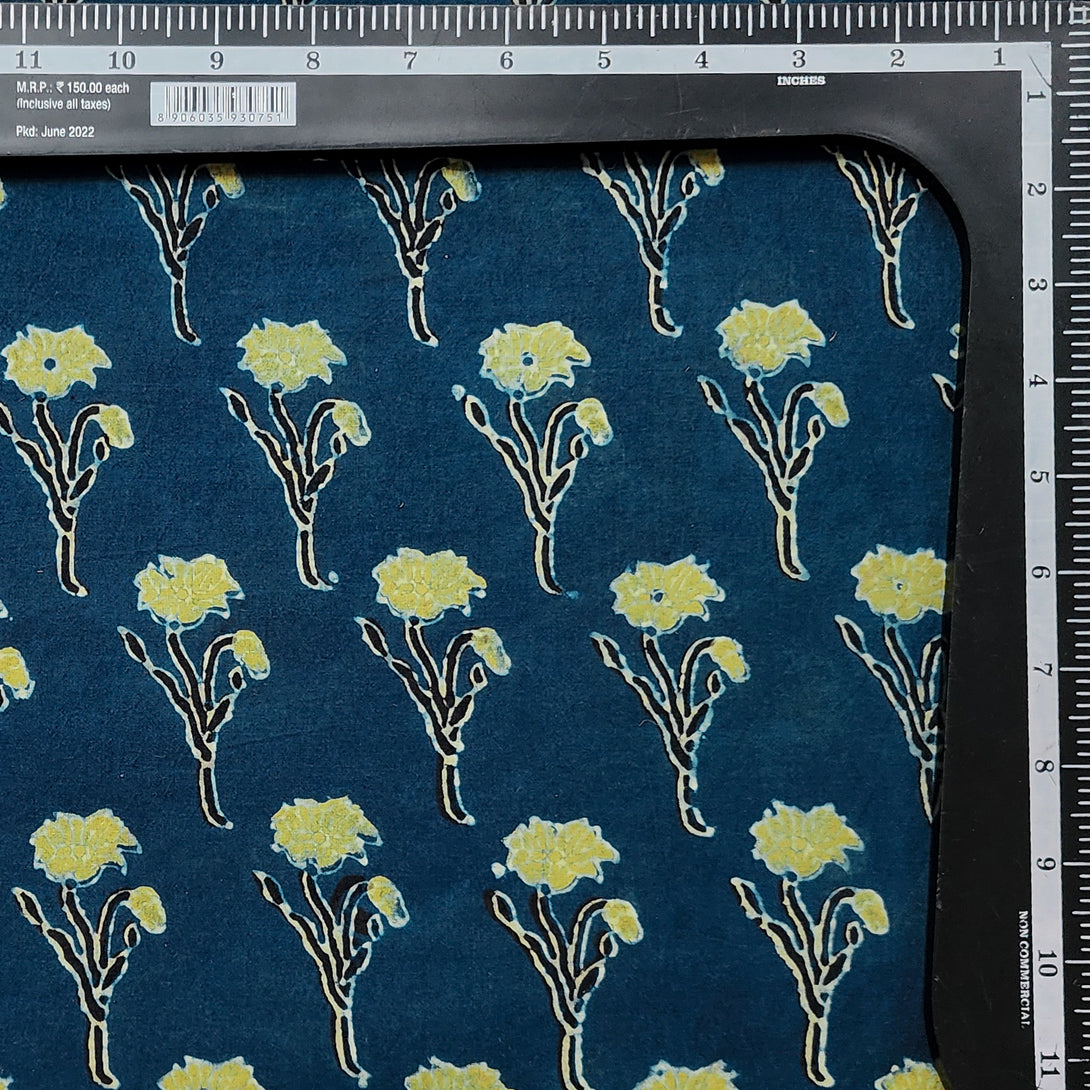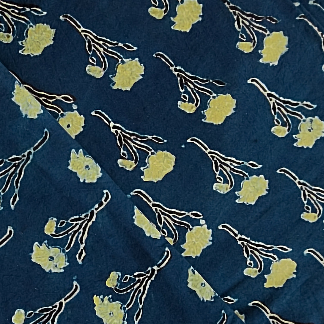 Pure Cotton Gad Ajrak Blue With Sandy Brown Flower Motif Hand Block Print Fabric