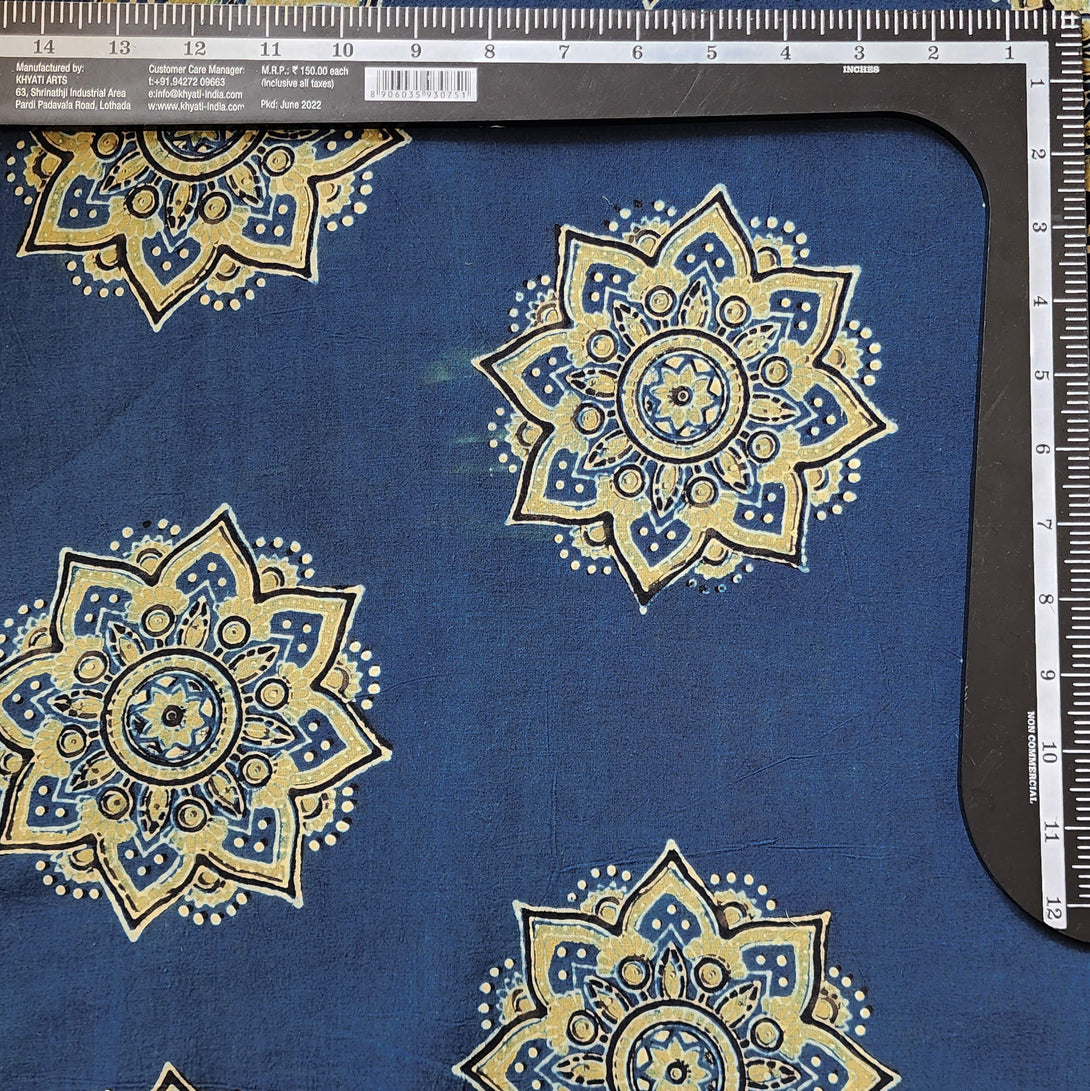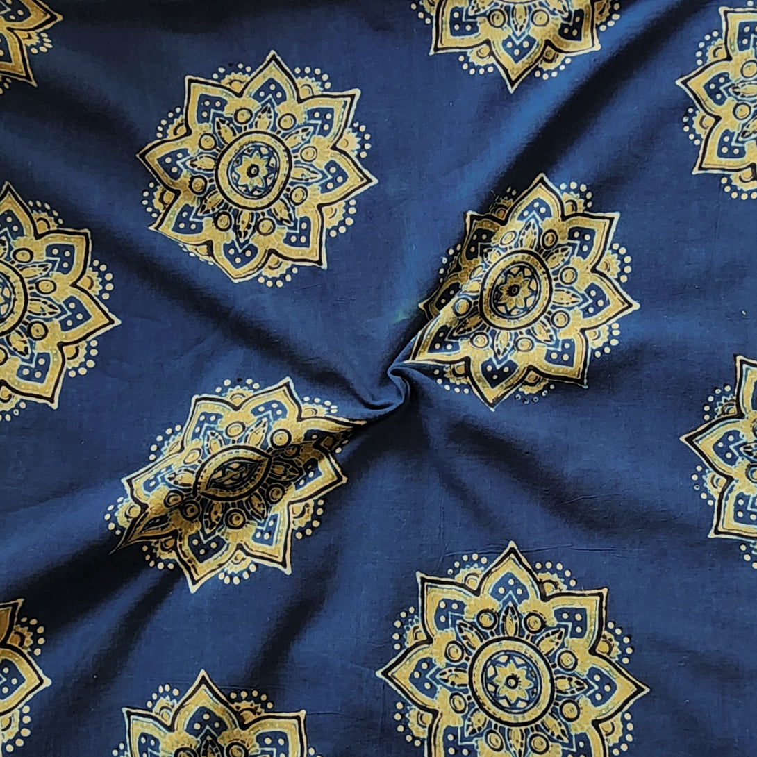 Pure Cotton Gad Ajrak Blue With Shade Of Green And Mustard Mandala Hand Block Print Fabric