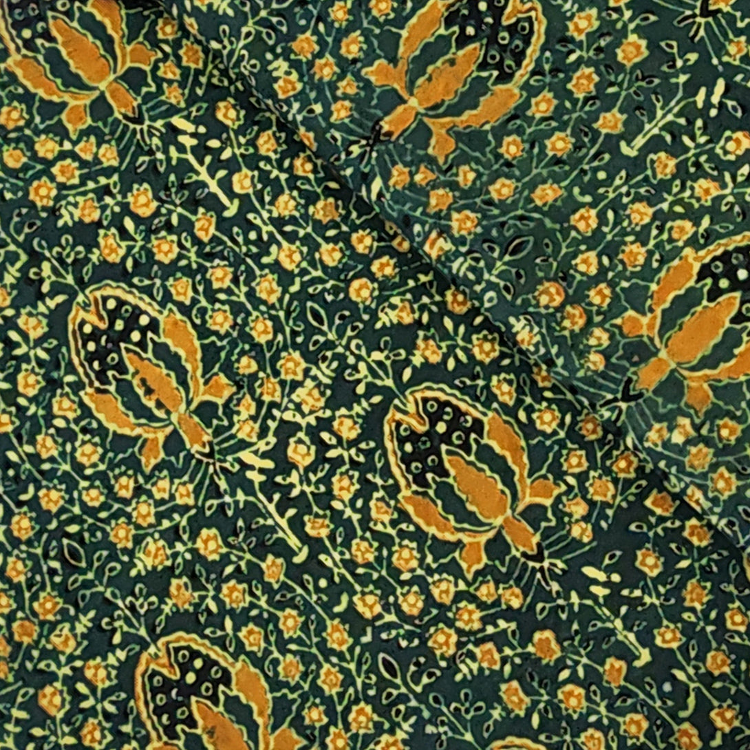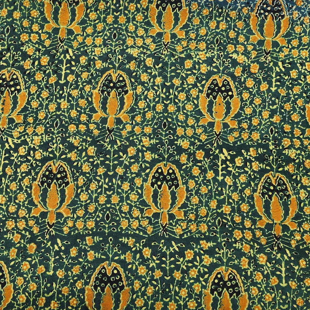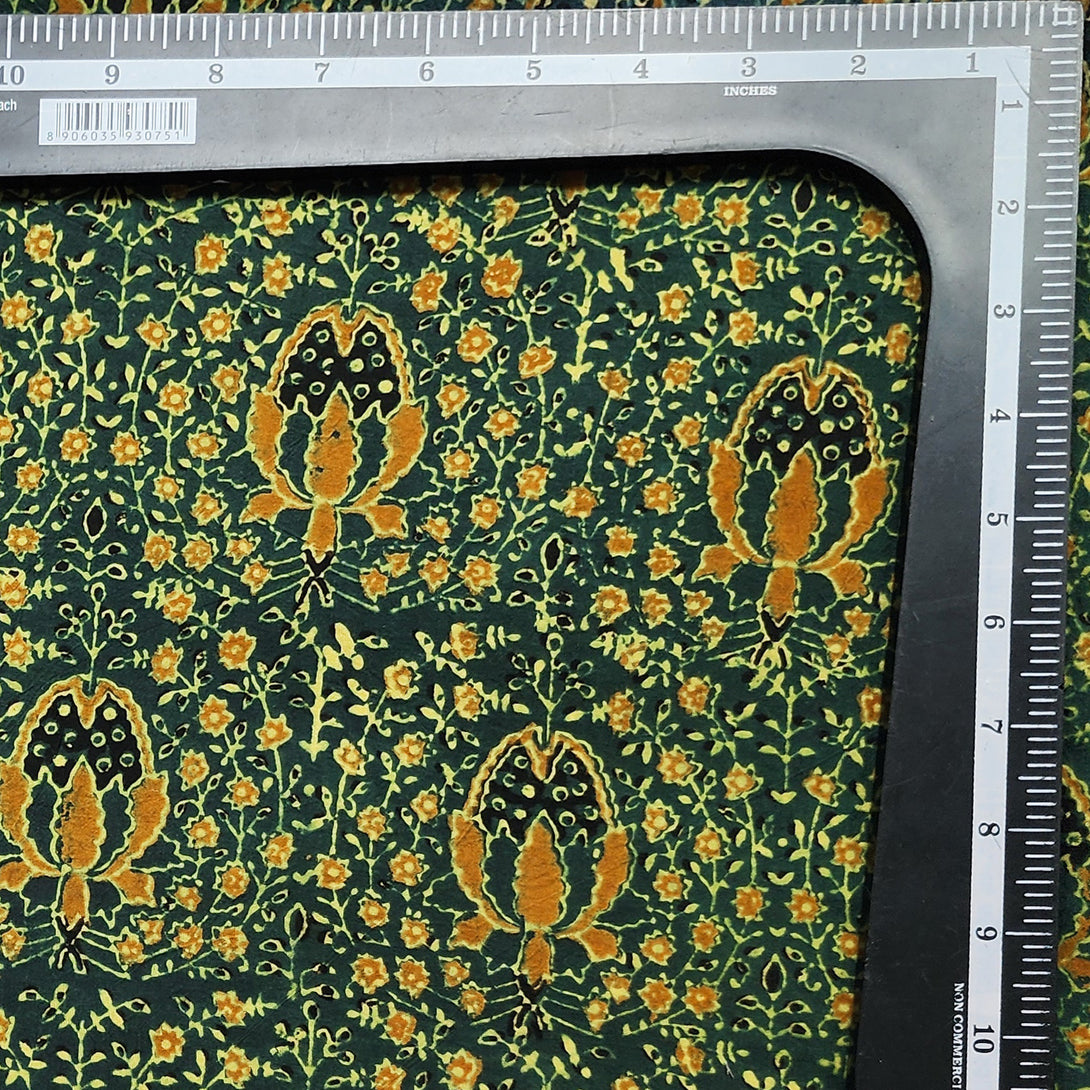 Pure Cotton Gad Ajrak Dark Green With Mustard Flower And Fruit Jaal Hand Block Print Fabric