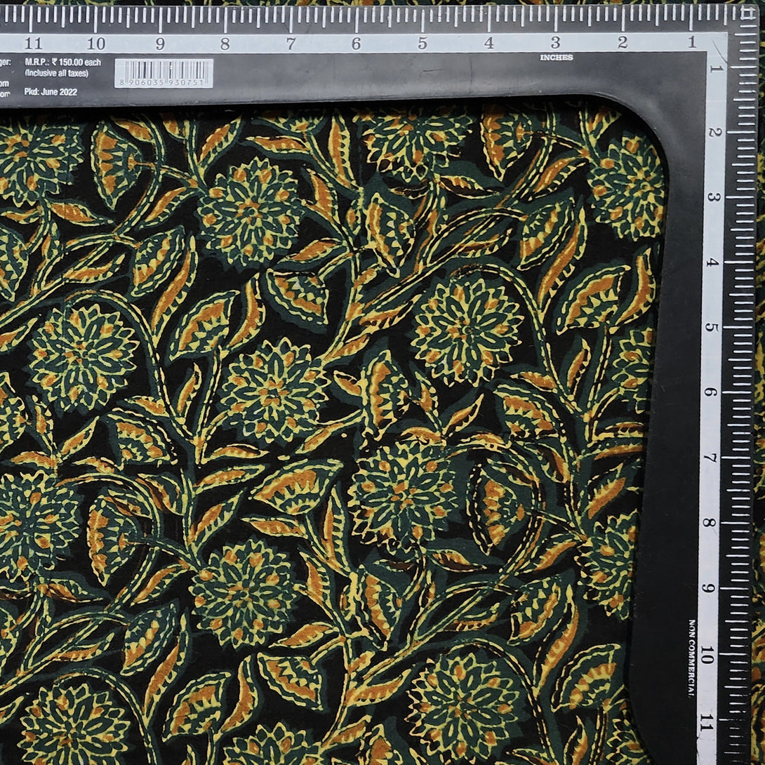 Pure Cotton Gad Ajrak Dark Green With Mustard Flower Jaal Hand Block Print Fabric