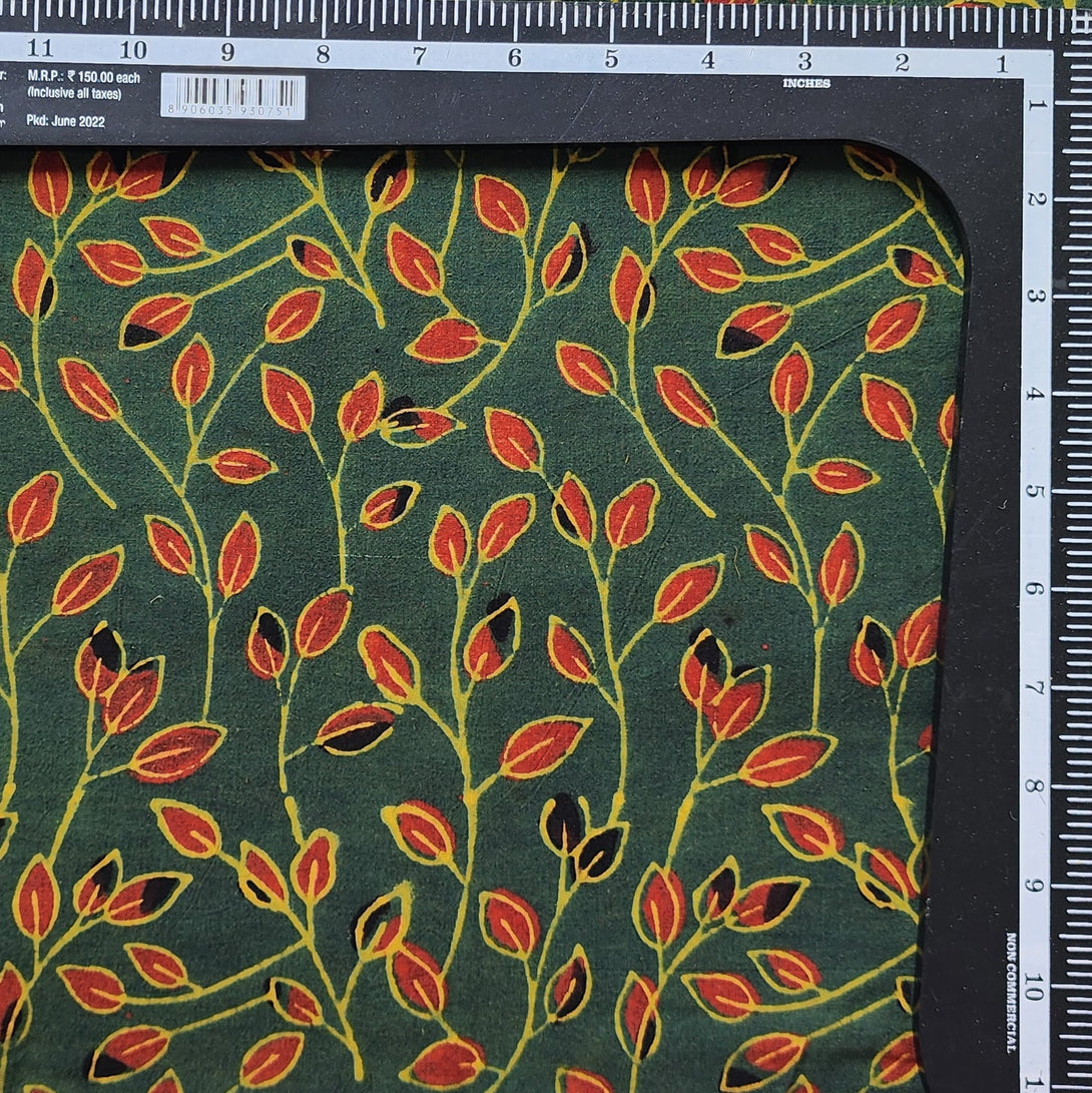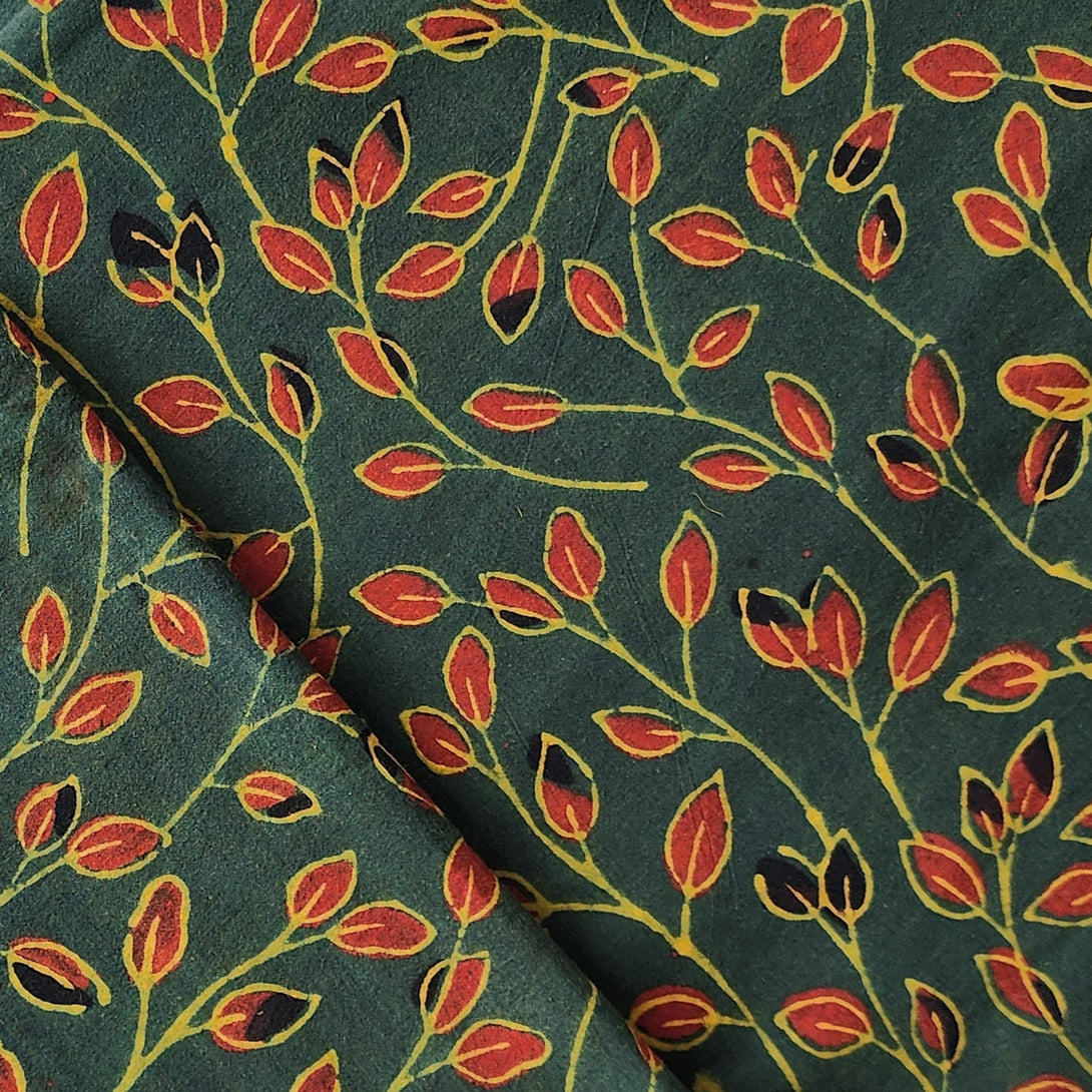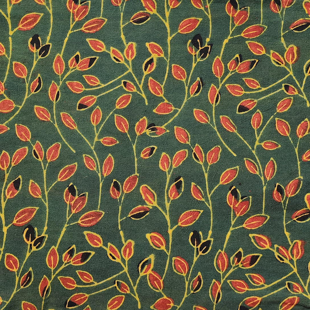 Pure Cotton Gad Ajrak Green With Orange Leaves Creeper Hand Block Print Fabric