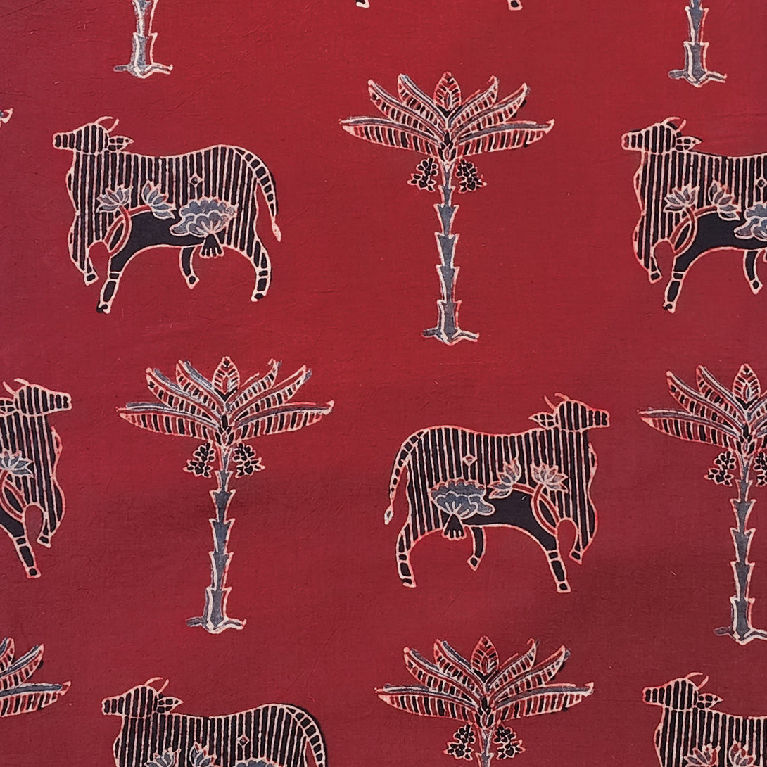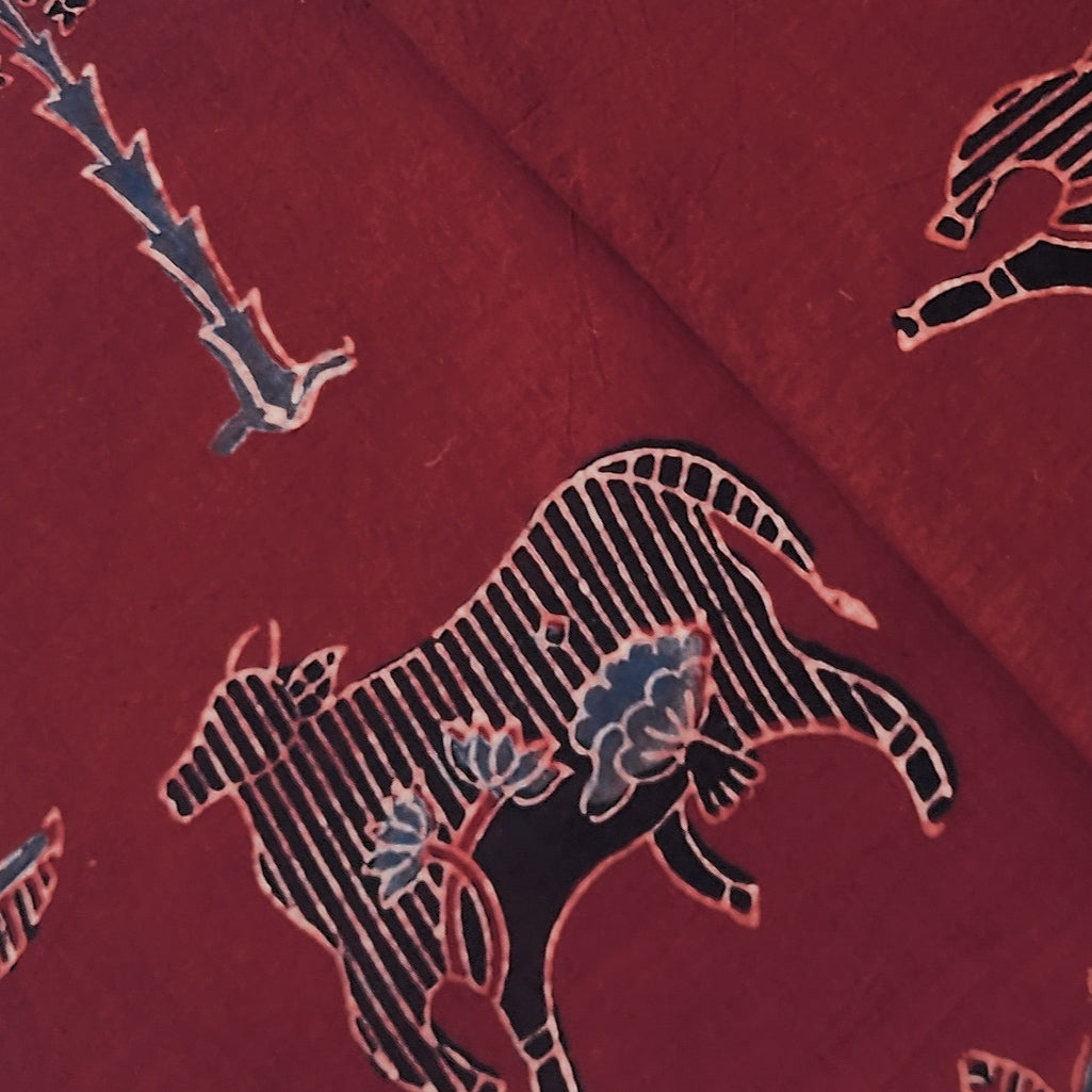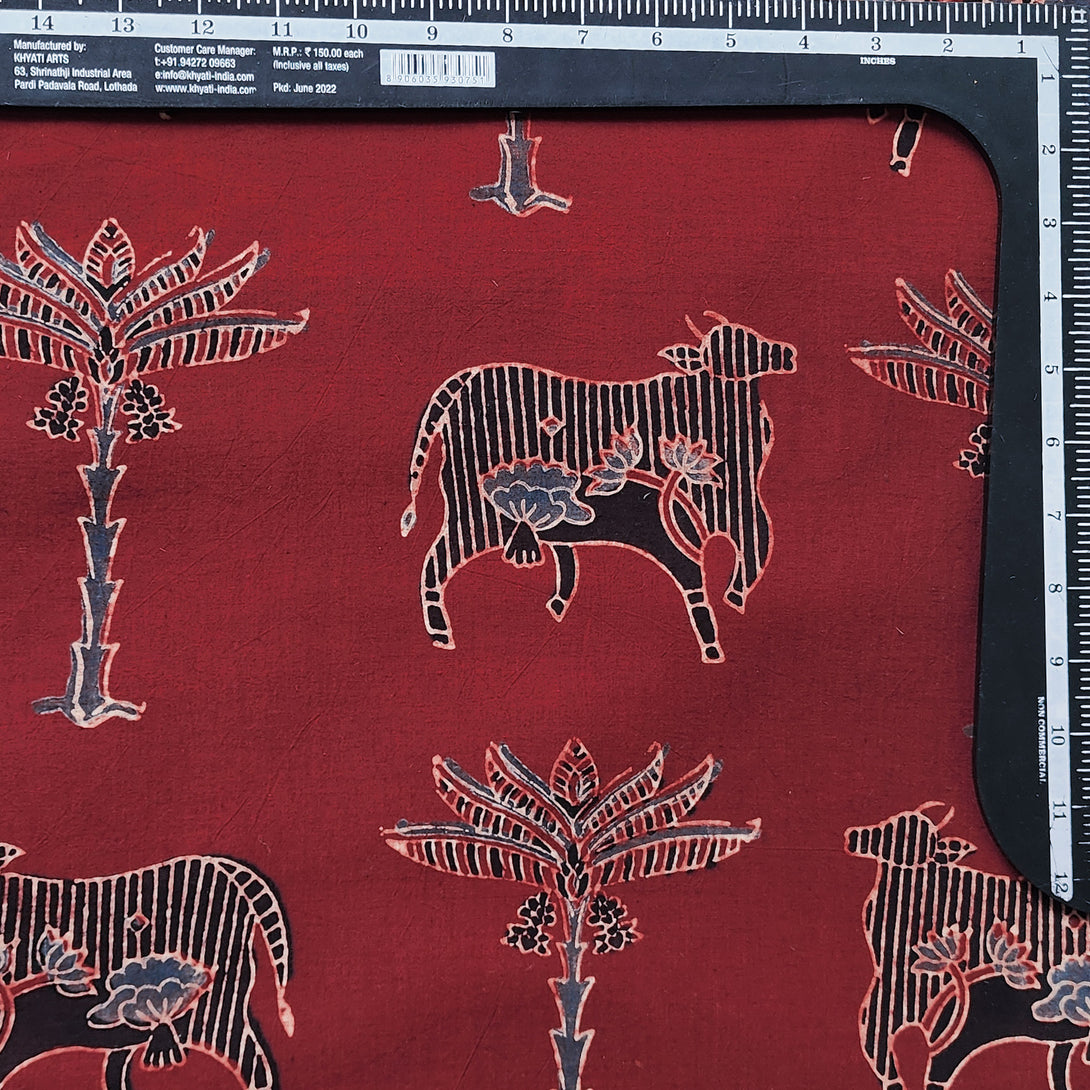 Pure Cotton Gad Ajrak Maroon With Rust Blue And Black Cow And Tree Motif Hand Block Print Fabric