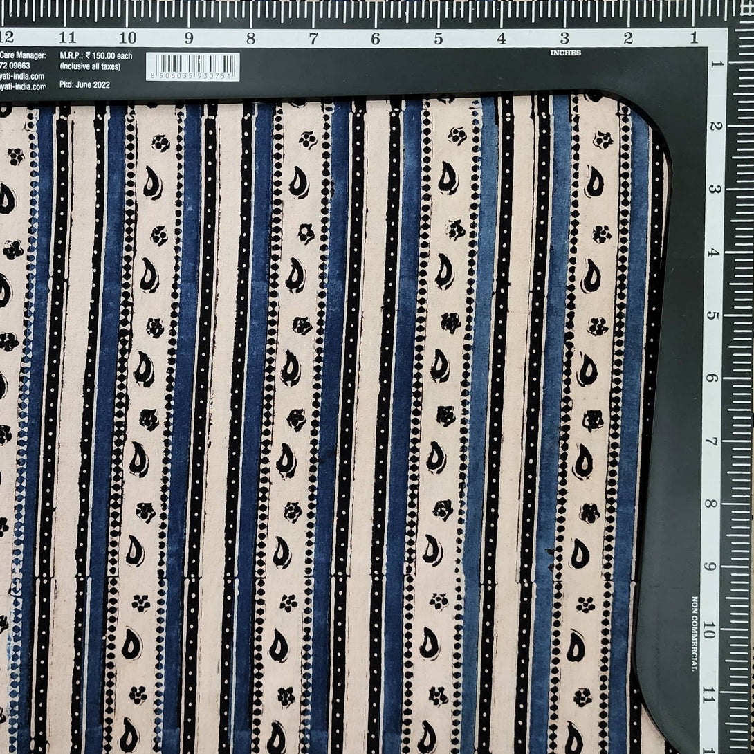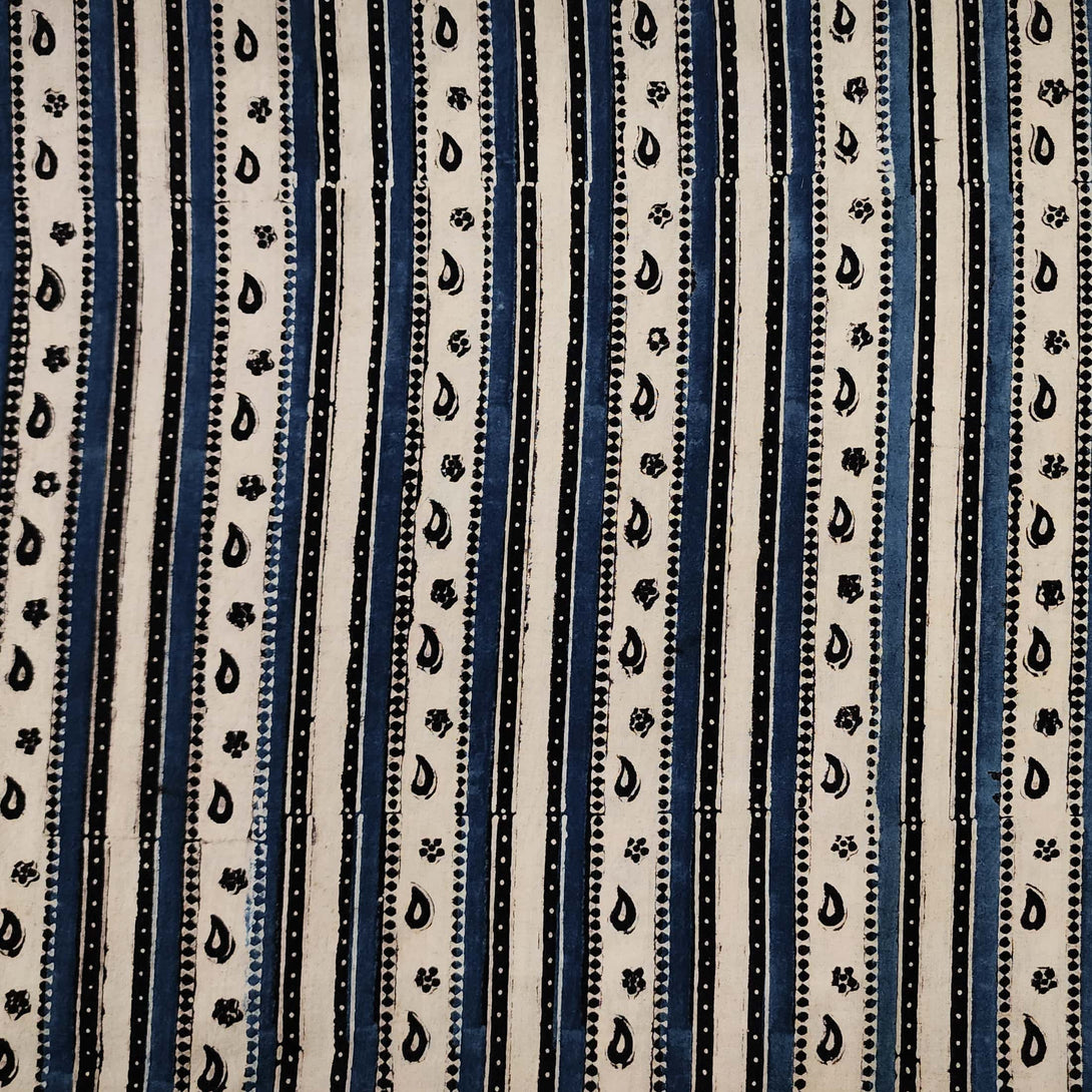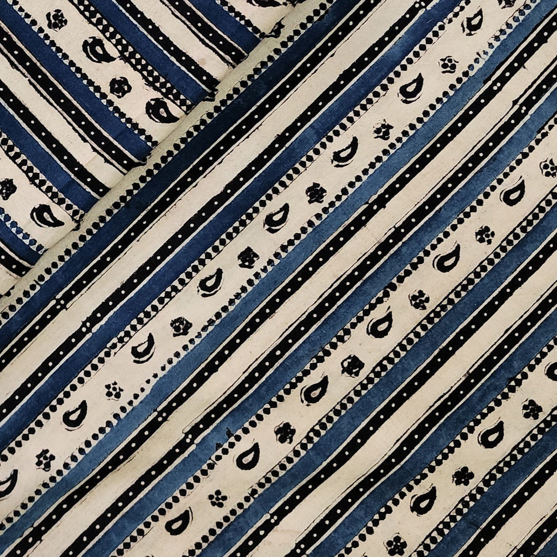 Pure Cotton Gad Ajrak Off White With Black And Blue Intricate Design Border Hand Block Print Fabric