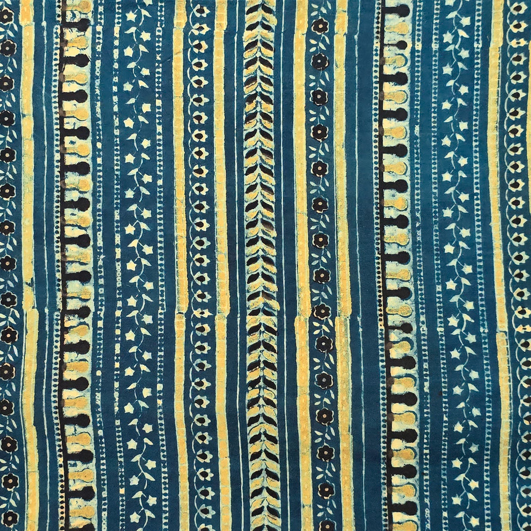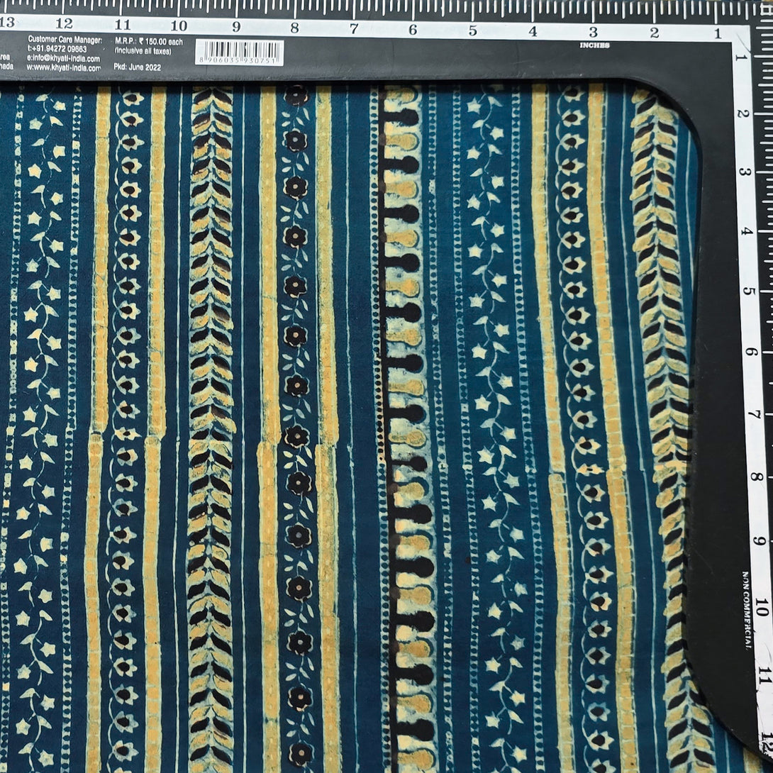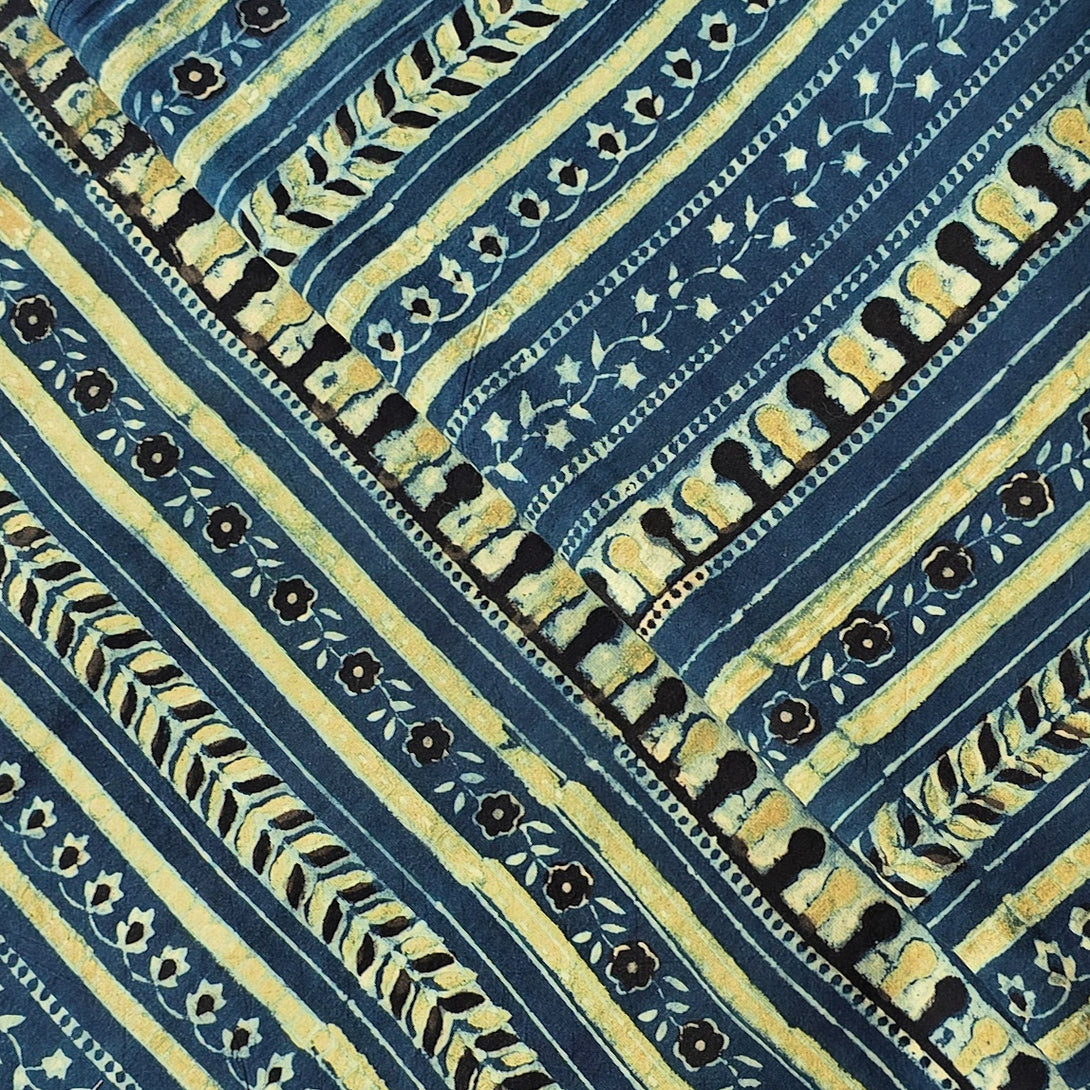 Pure Cotton Gad Ajrak Rust Blue With Mustard Border Design Stripes Hand Block Print Fabric