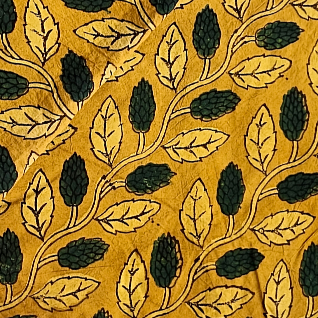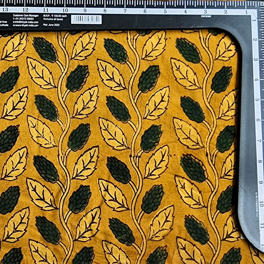 Pure Cotton Gad Ajrak Yellow With Green Leaves Creeper Hand Block Print Fabric