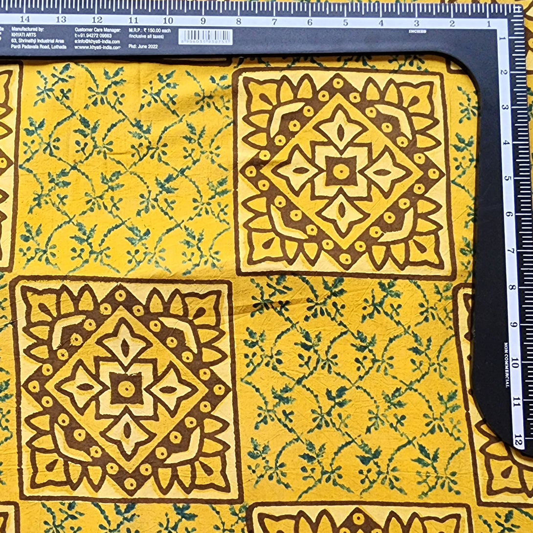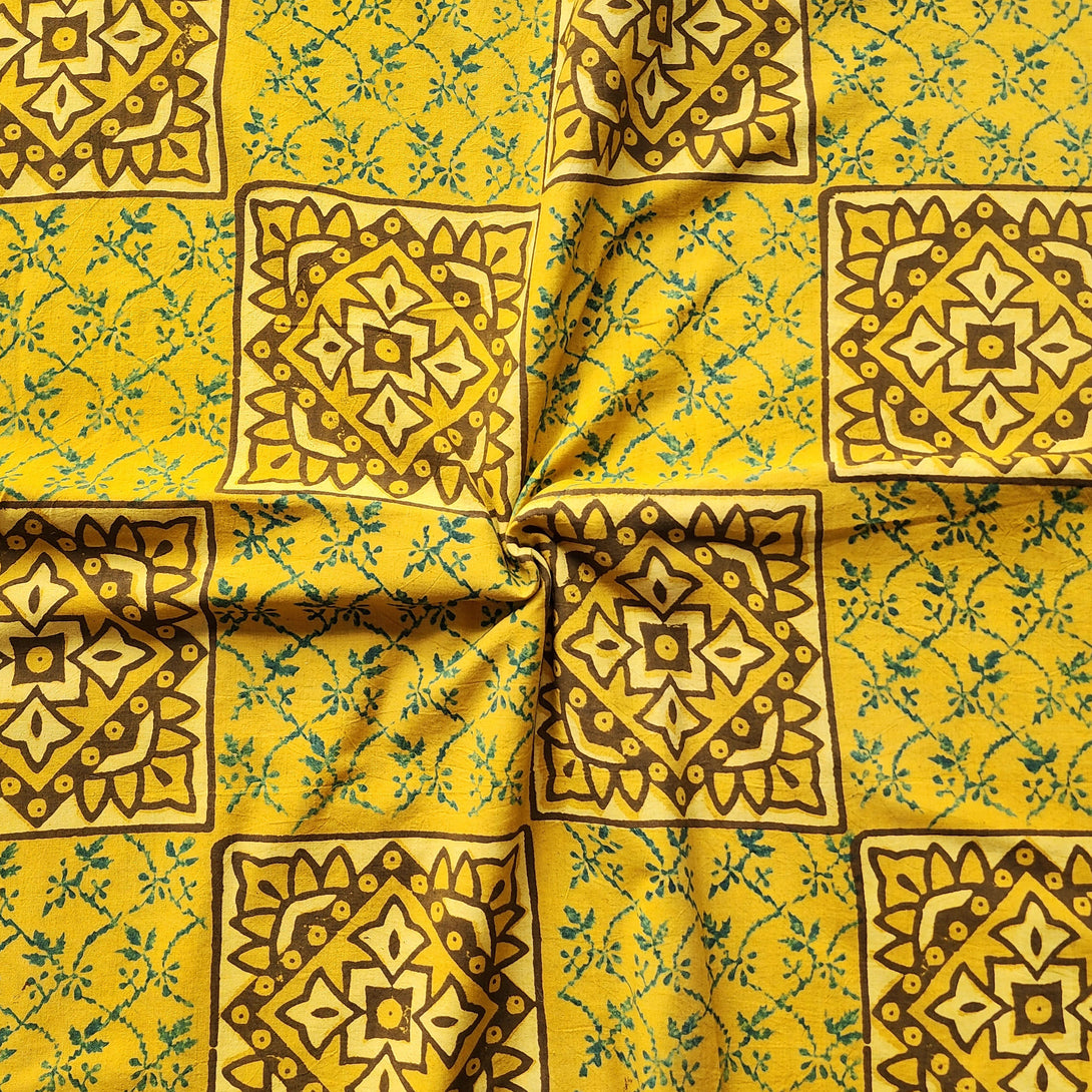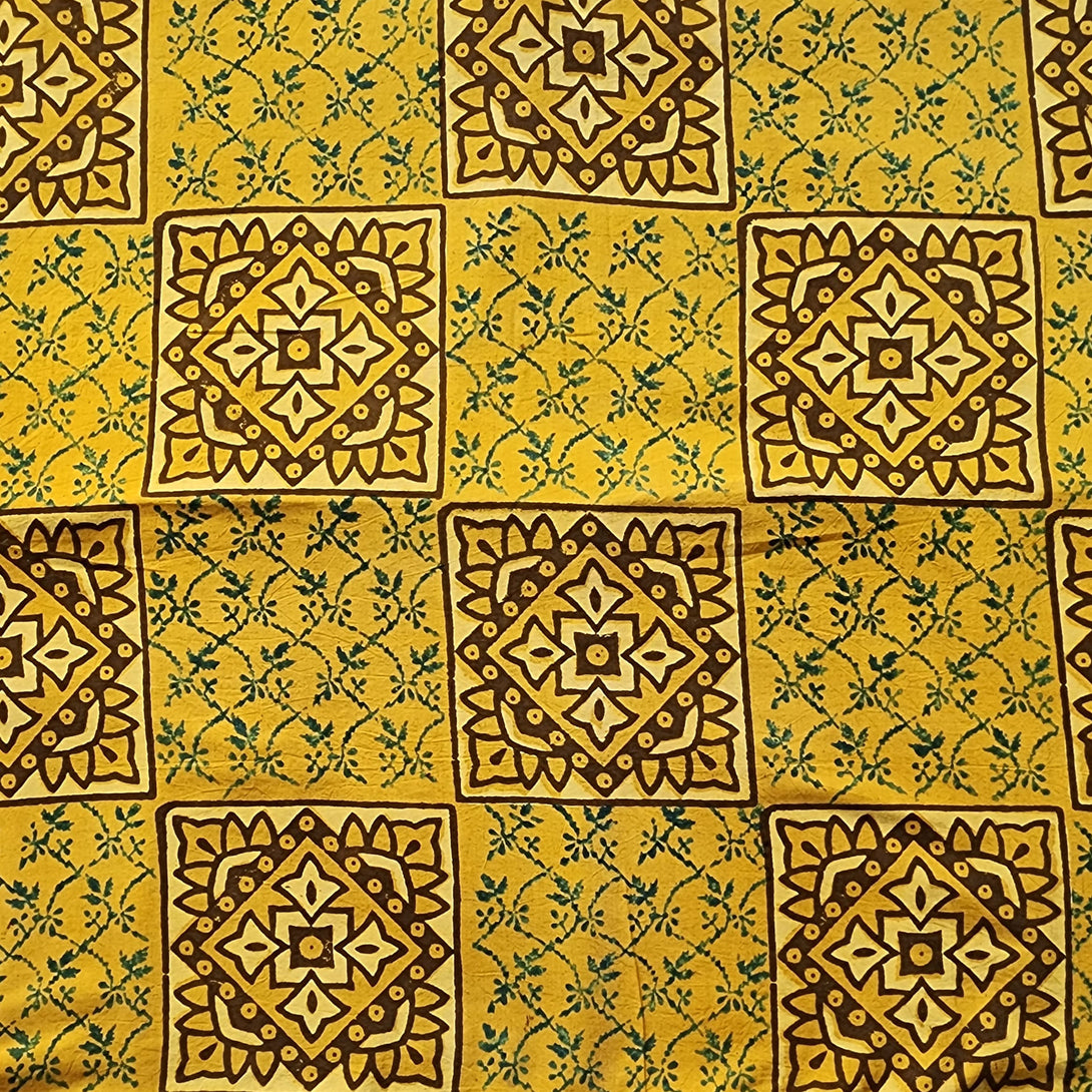 Pure Cotton Gad Ajrak Yellow with Square mandala design Hand Block Print Fabric