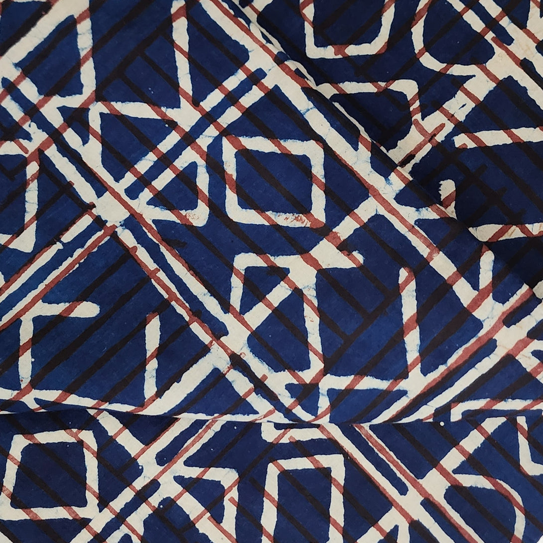 Pure Cotton Indigo Abstract With Rust Lines Hand Block Print Fabric