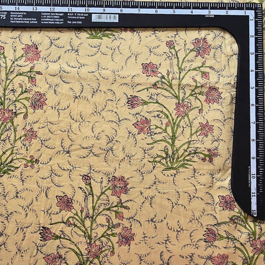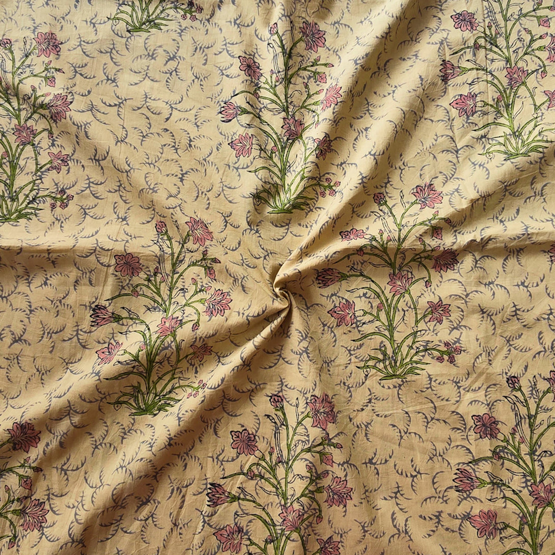 Pure Cotton Jaipuri Beige With Baby Pink and Green Flower Jaal Hand Block Print Fabric