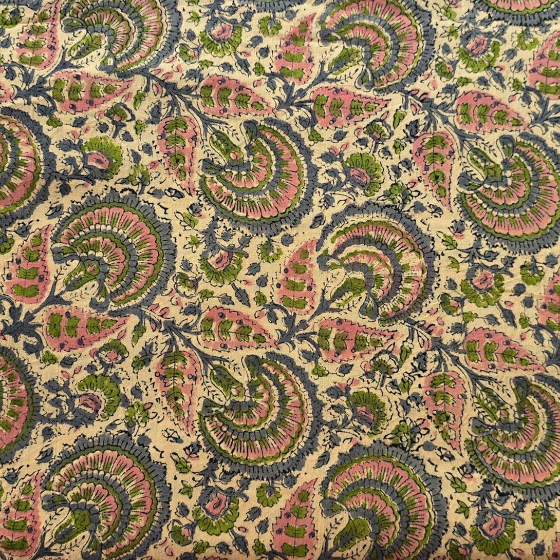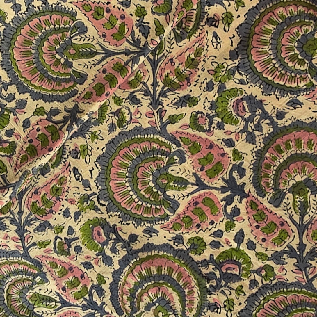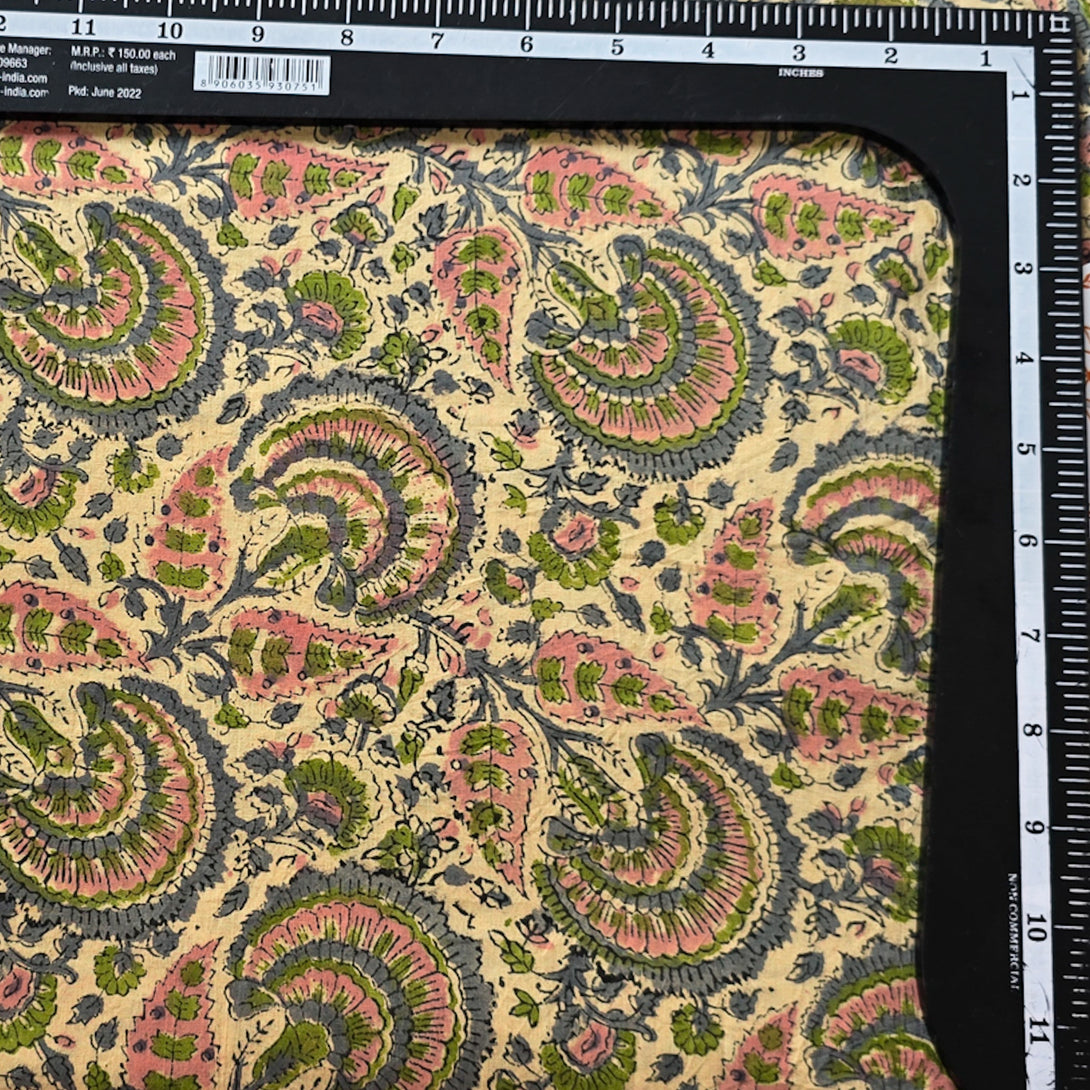 Pure Cotton Jaipuri Beige With Baby Pink and Grey Flower Jaal Hand Block Print Fabric
