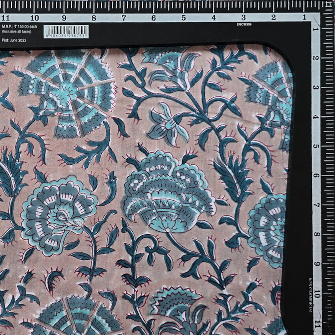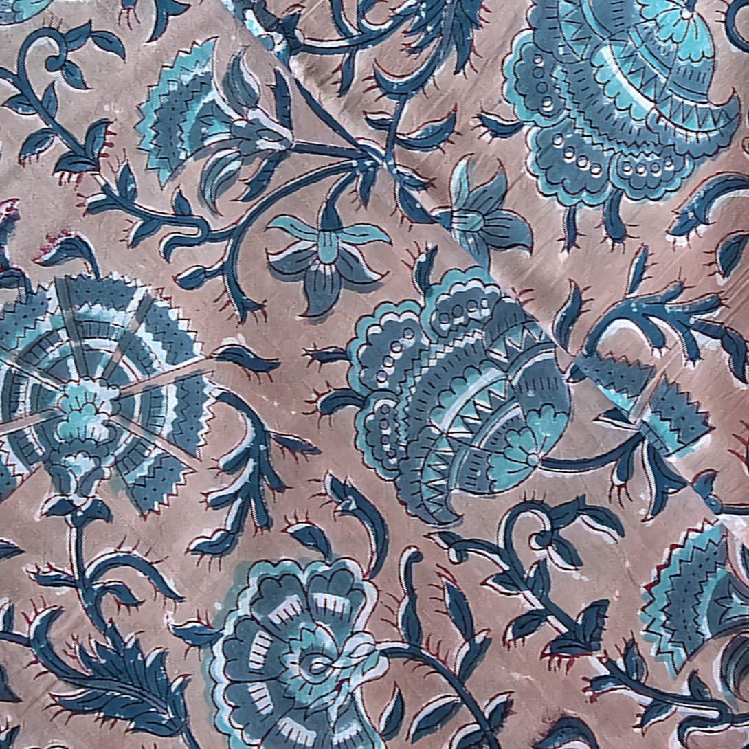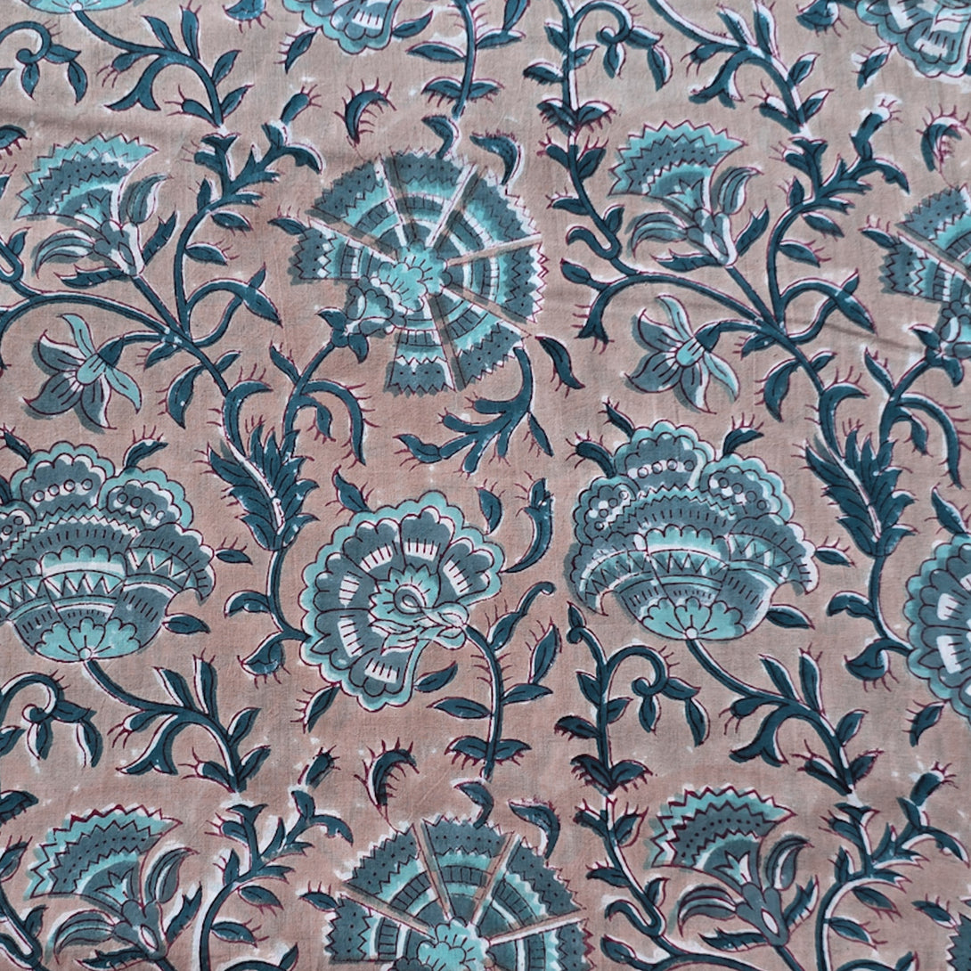 Pure Cotton Jaipuri Light Brown With Teal Flower Jaal Hand Block Print Fabric