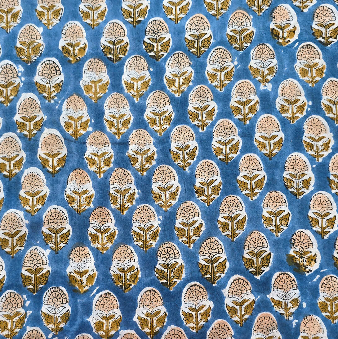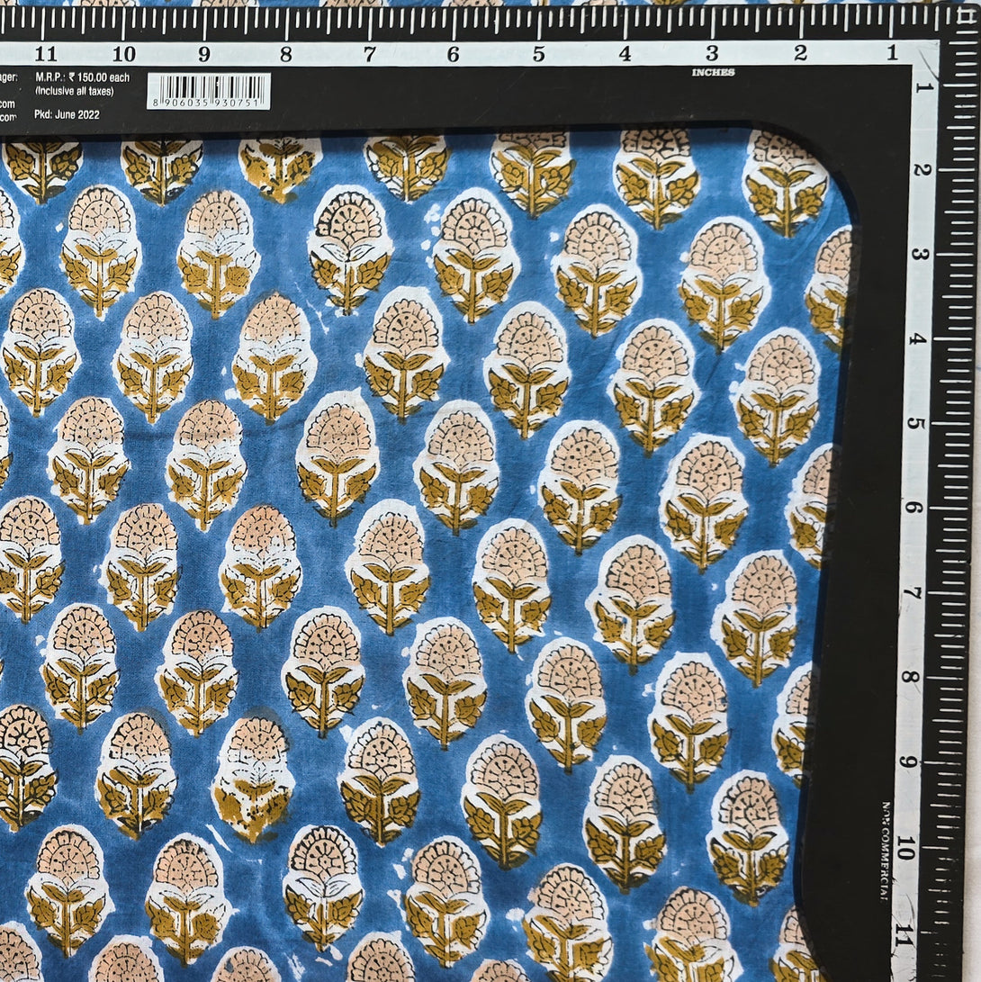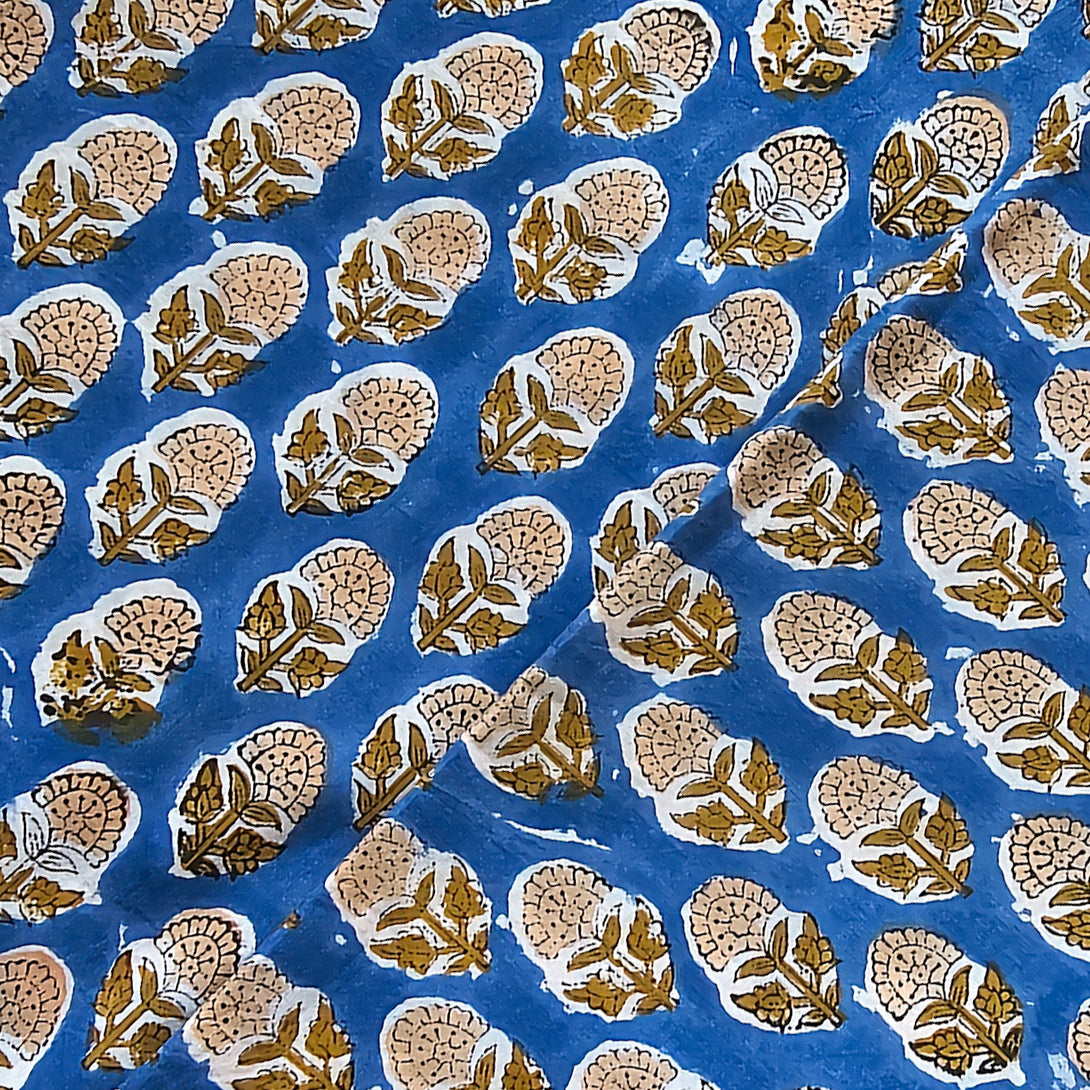 Pure Cotton Jaipuri Blue With Flower Motif Hand Block Print Fabric