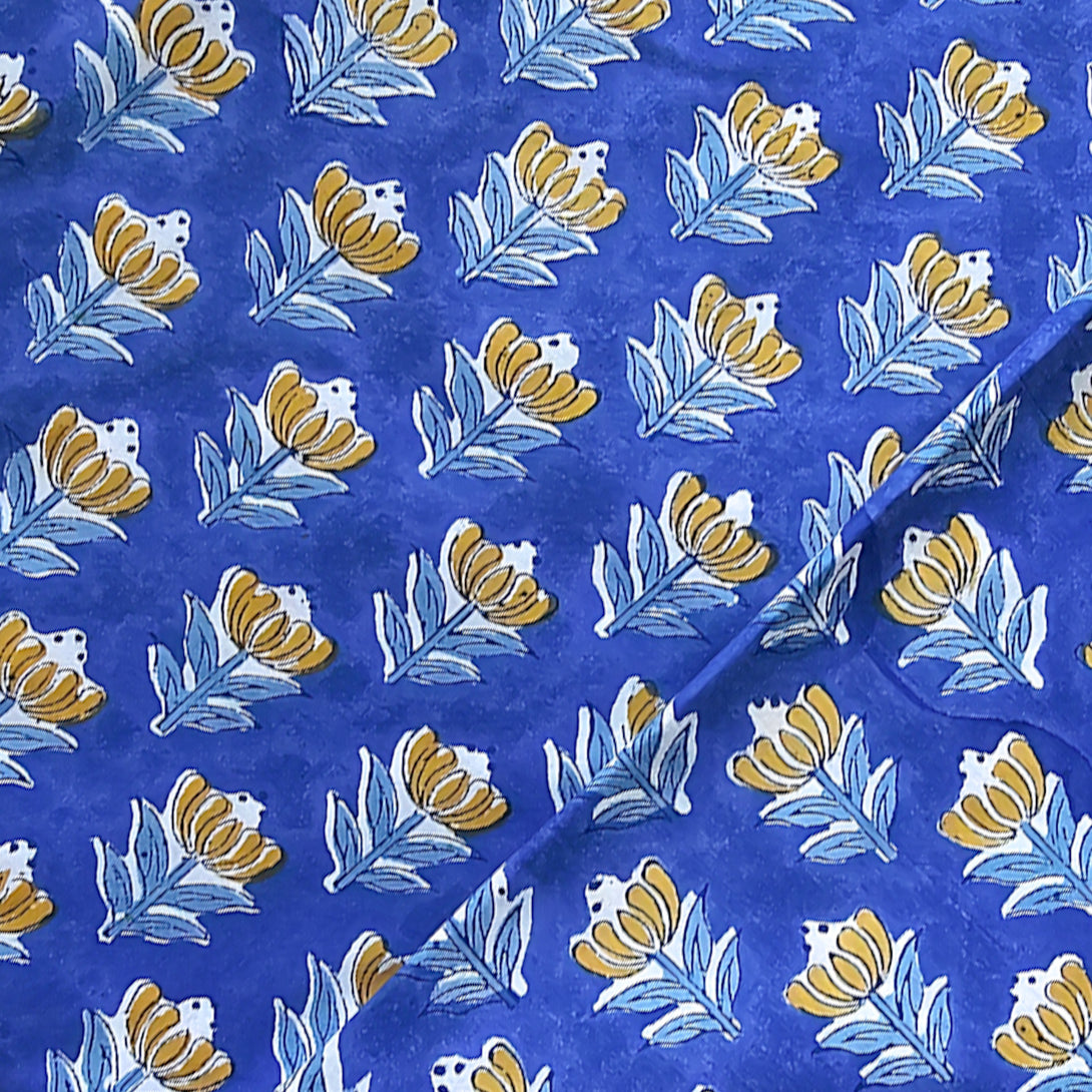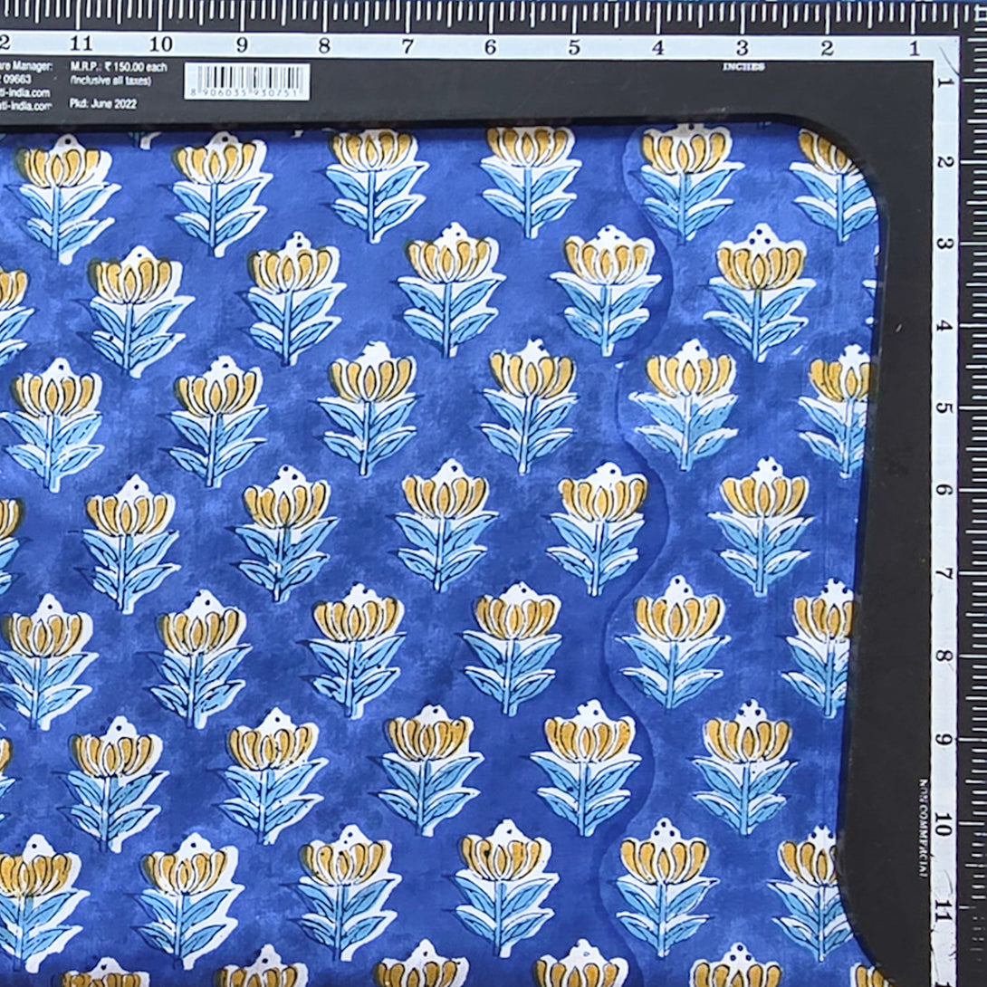 Pure Cotton Jaipuri Blue With Mustard Yellow Flower Motif Hand Block Print Fabric