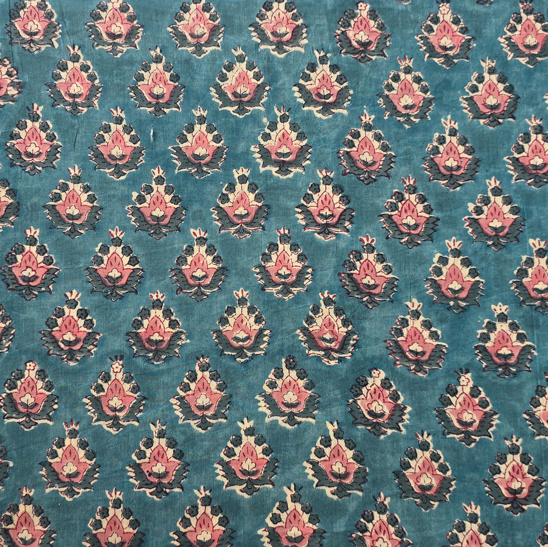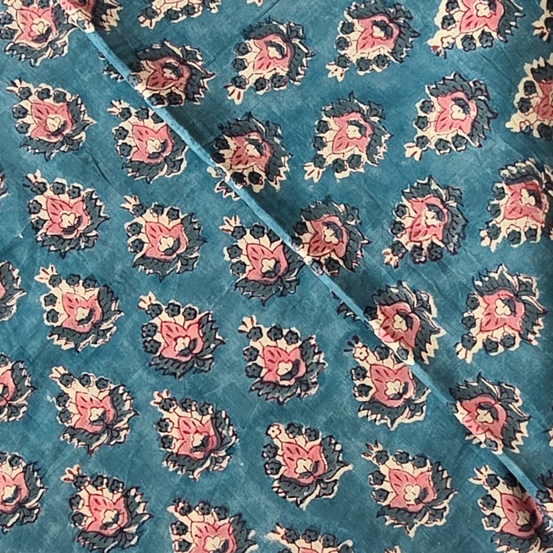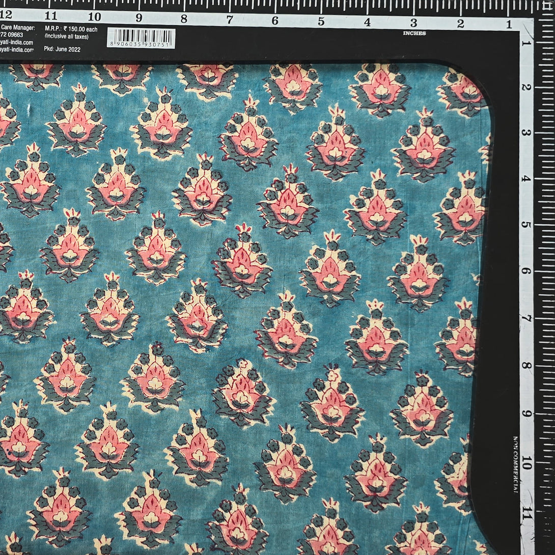 Pure Cotton Jaipuri Blue With Peach Flower Motif Hand Block Print Fabric