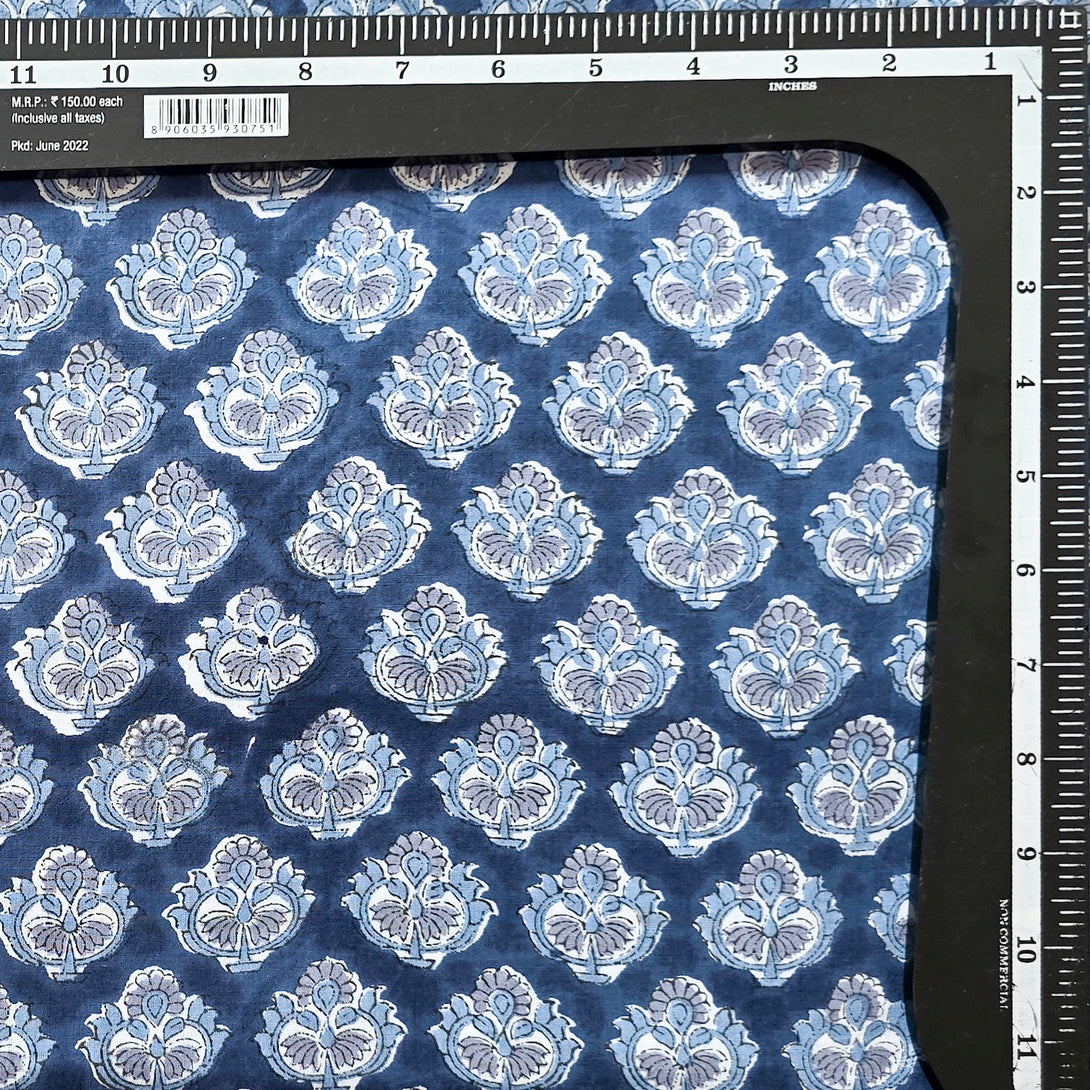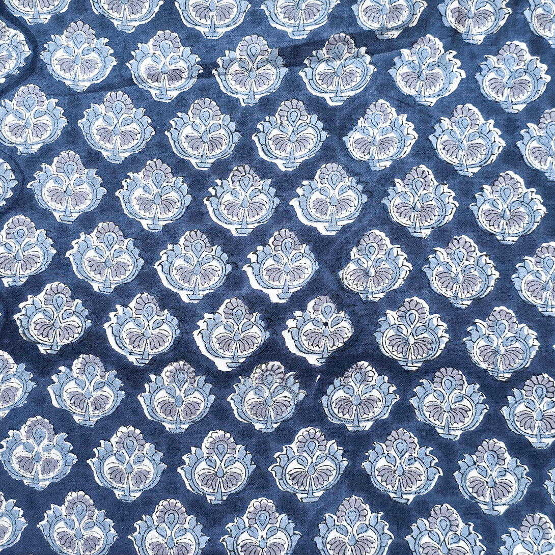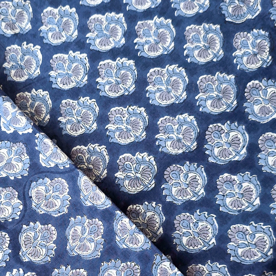 Pure Cotton Jaipuri Dark Blue With Grey and Light Blue Flower Motif Hand Block Print Fabric