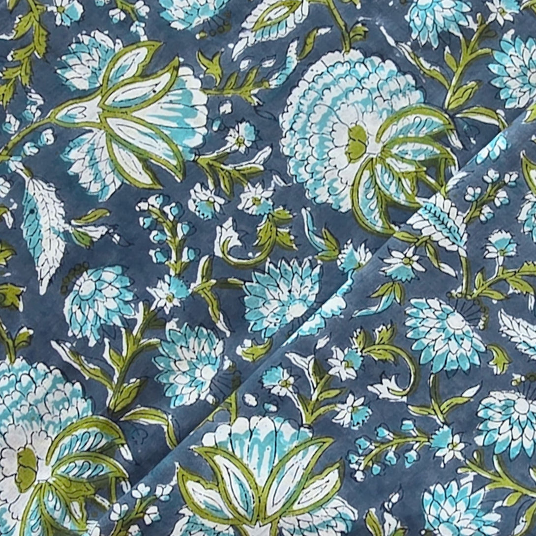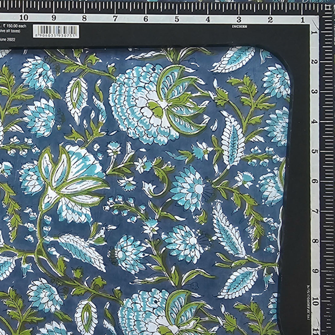 Pure Cotton Jaipuri Dark Grey With Blue Flower Jaal Hand Block Print Fabric