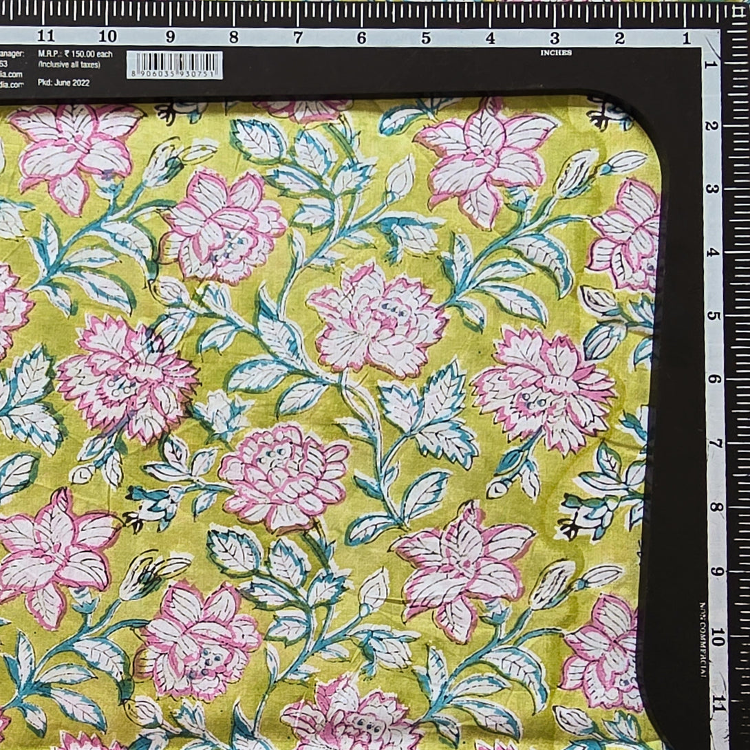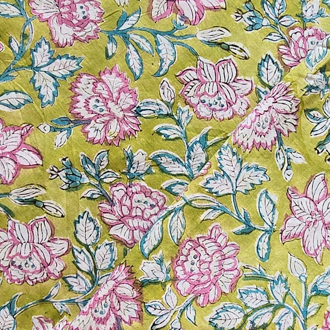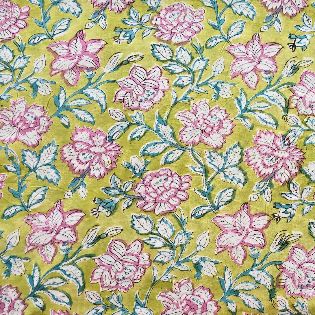Pure Cotton Jaipuri Green With Pink Flower Jaal Hand Block Print Fabric