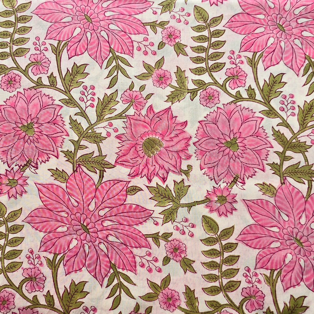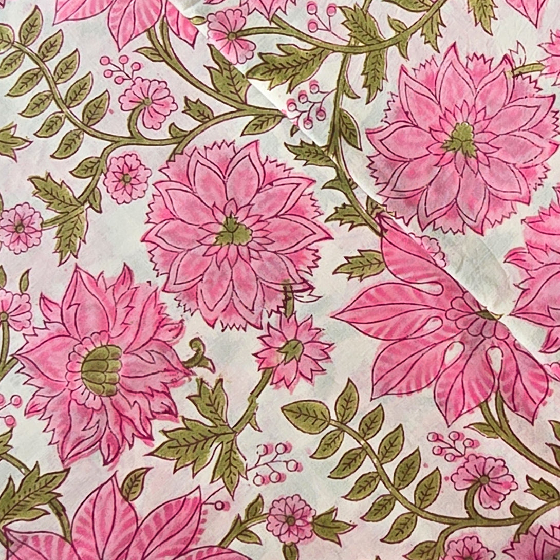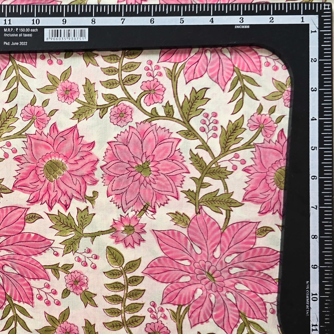 Pure Cotton Jaipuri Off White With Pink Flower Jaal Hand Block Print Fabric