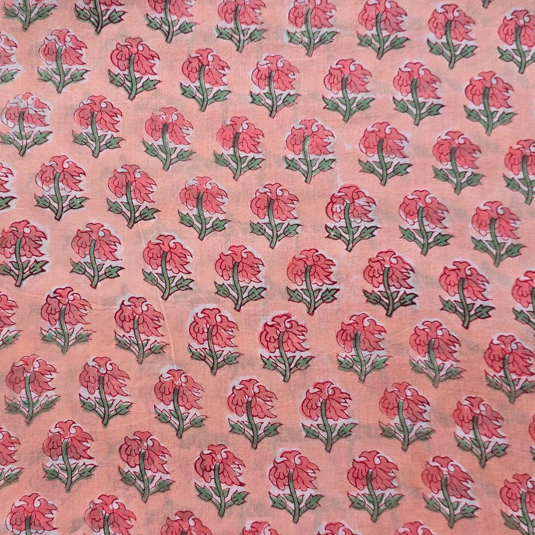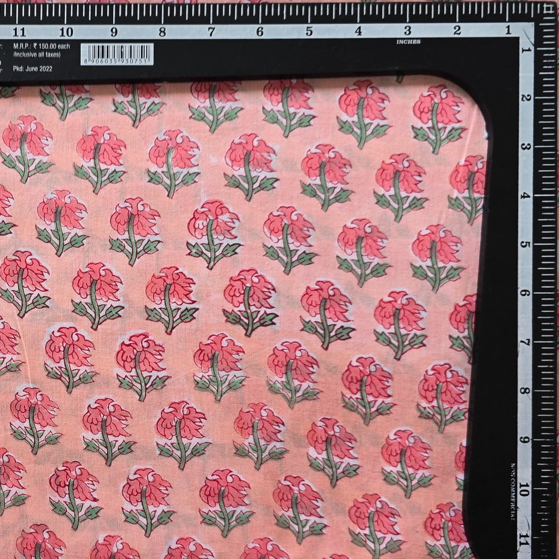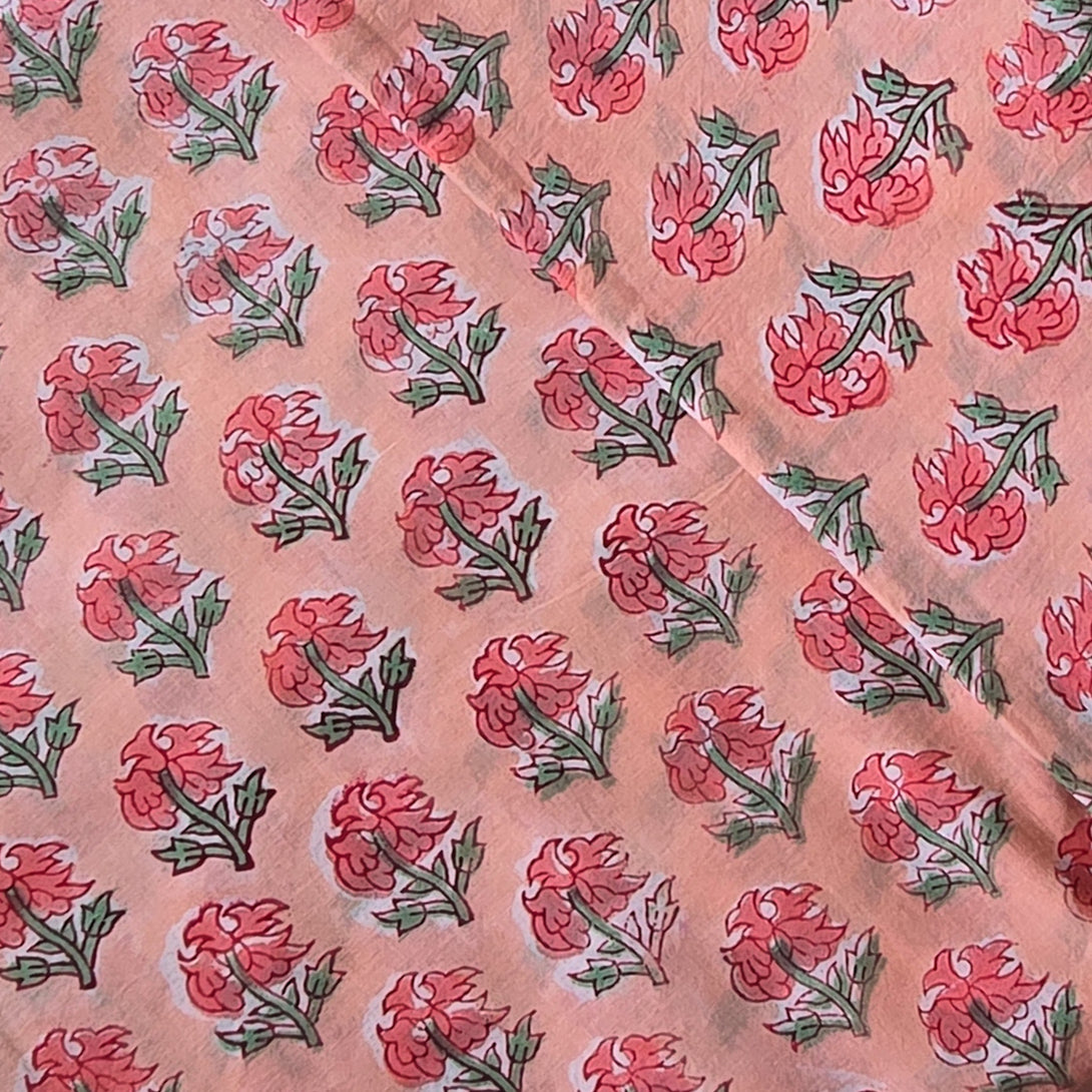 Pure Cotton Jaipuri Peach With Pink Flower Motif Hand Block Print Fabric