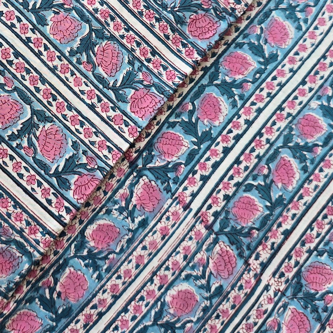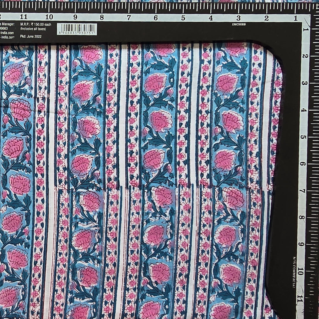 Pure Cotton Jaipuri Pink Flower With Blue Stripe Border Design Hand Block Print Fabric