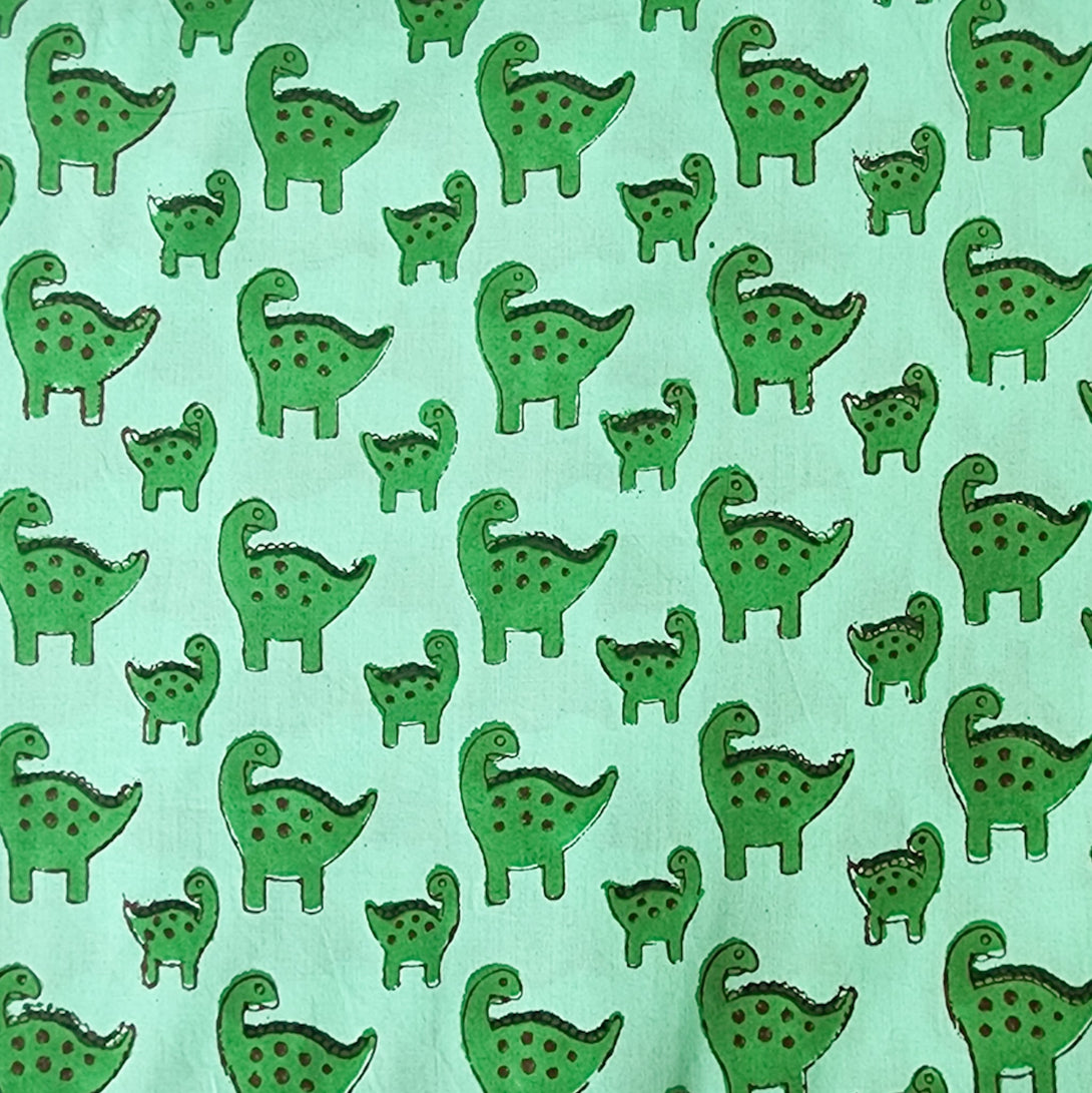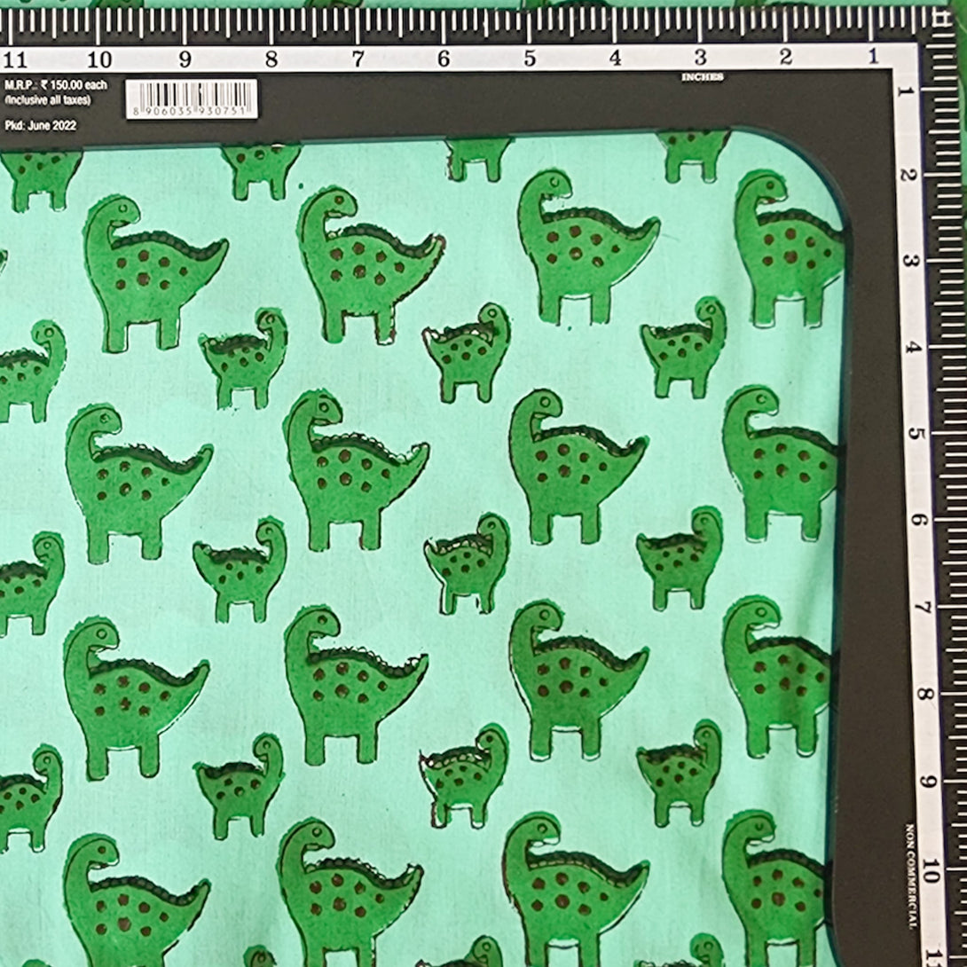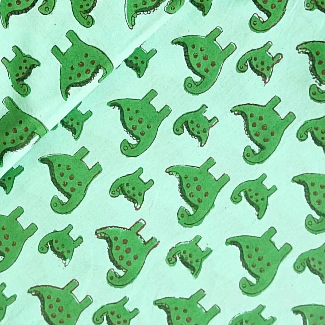 Pure Cotton Jaipuri Redium Green With Green Dinosaur Hand Block Print Fabric