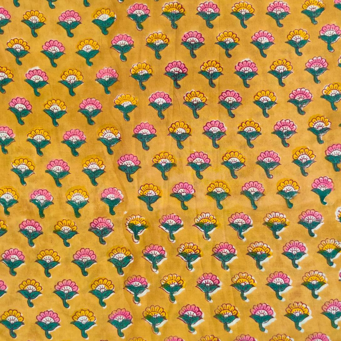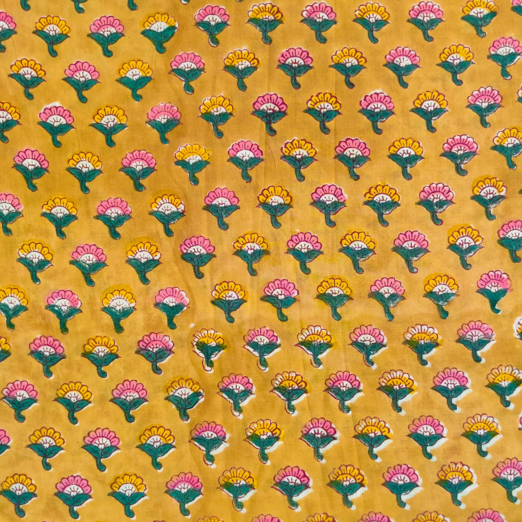 Pure Cotton Jaipuri Sandy Brown With Pink And Yellow Flower Motifs Hand Block Print Fabric