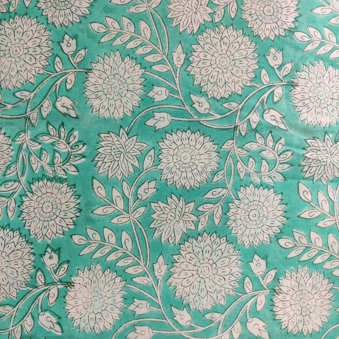 Pure Cotton Jaipuri Sea Green With Floral Jaal Hand Block Print Fabric (pre cut 1.85)