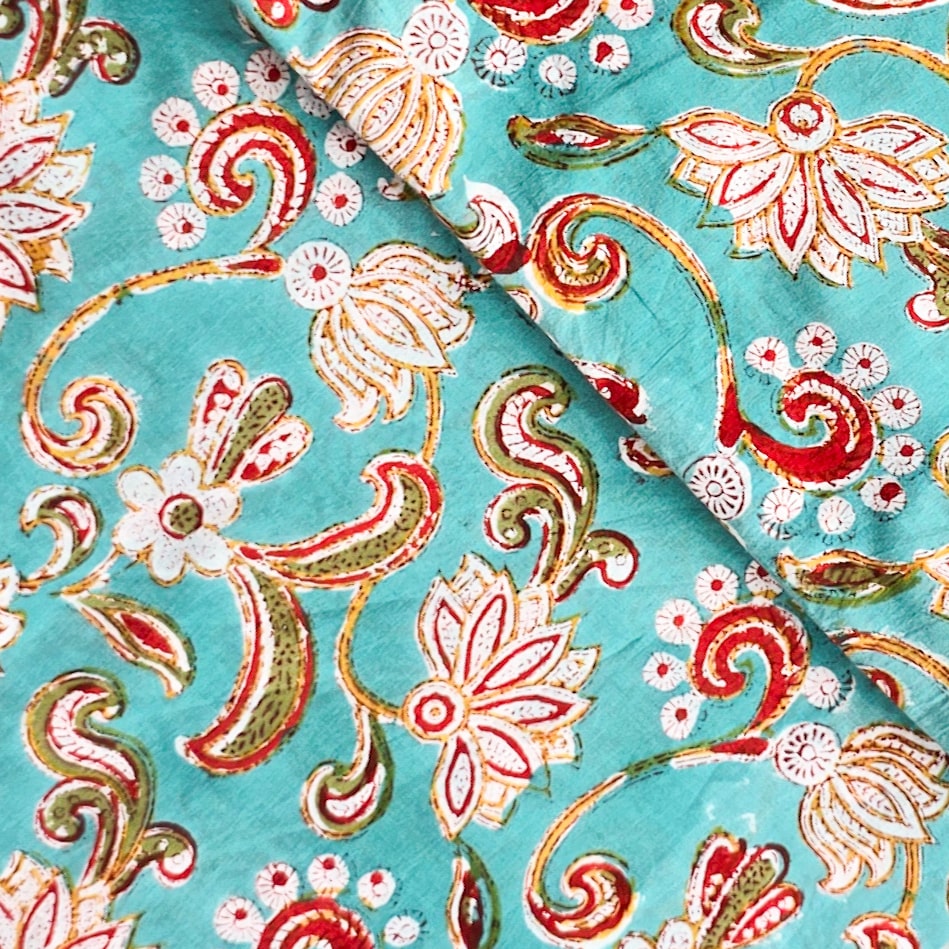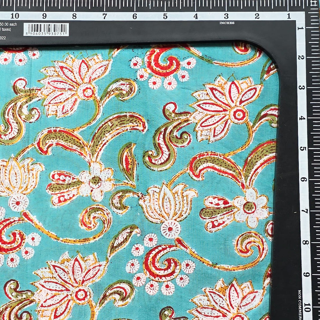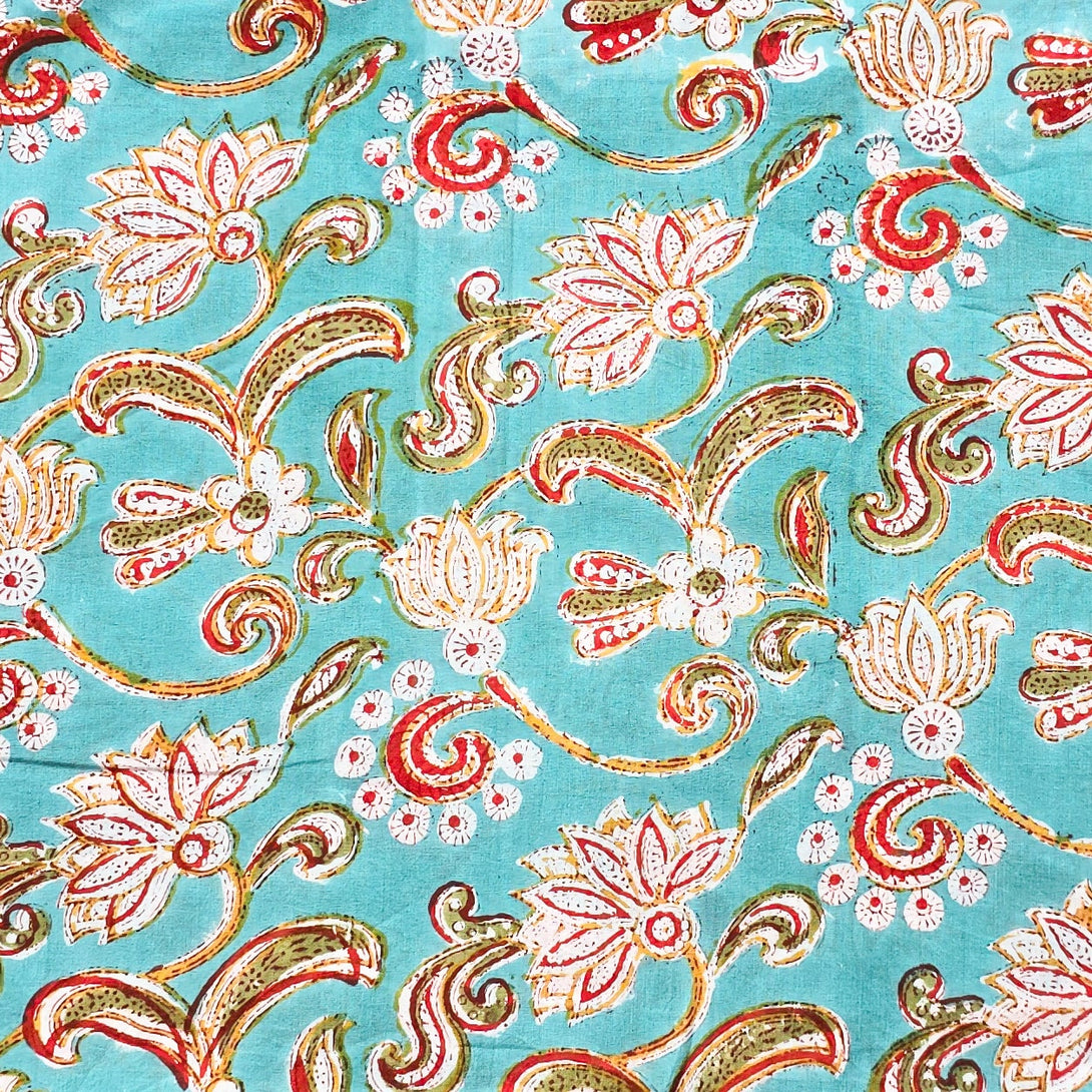 Pure Cotton Jaipuri See Blue With White And Red Flower Jaal Hand Block Print Fabric
