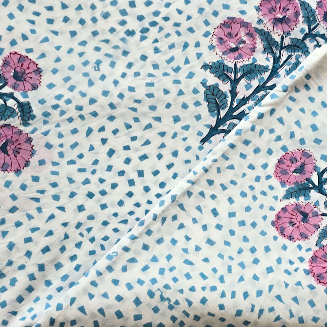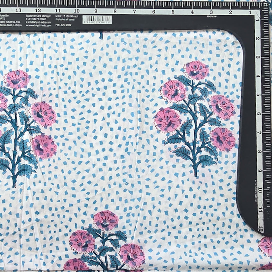 Pure Cotton Jaipuri White With Blue Self Design And Pink Plant Motif Hand Block Print Fabric