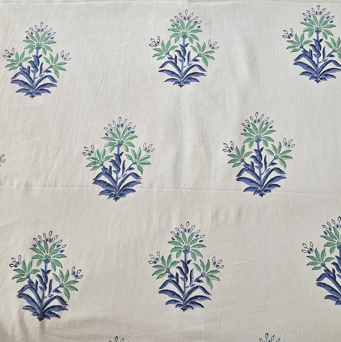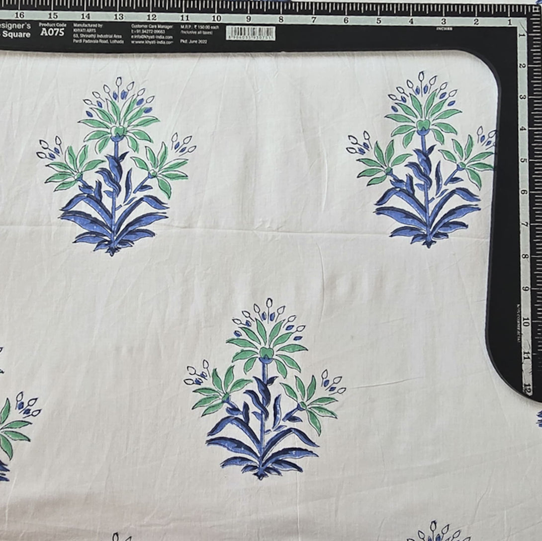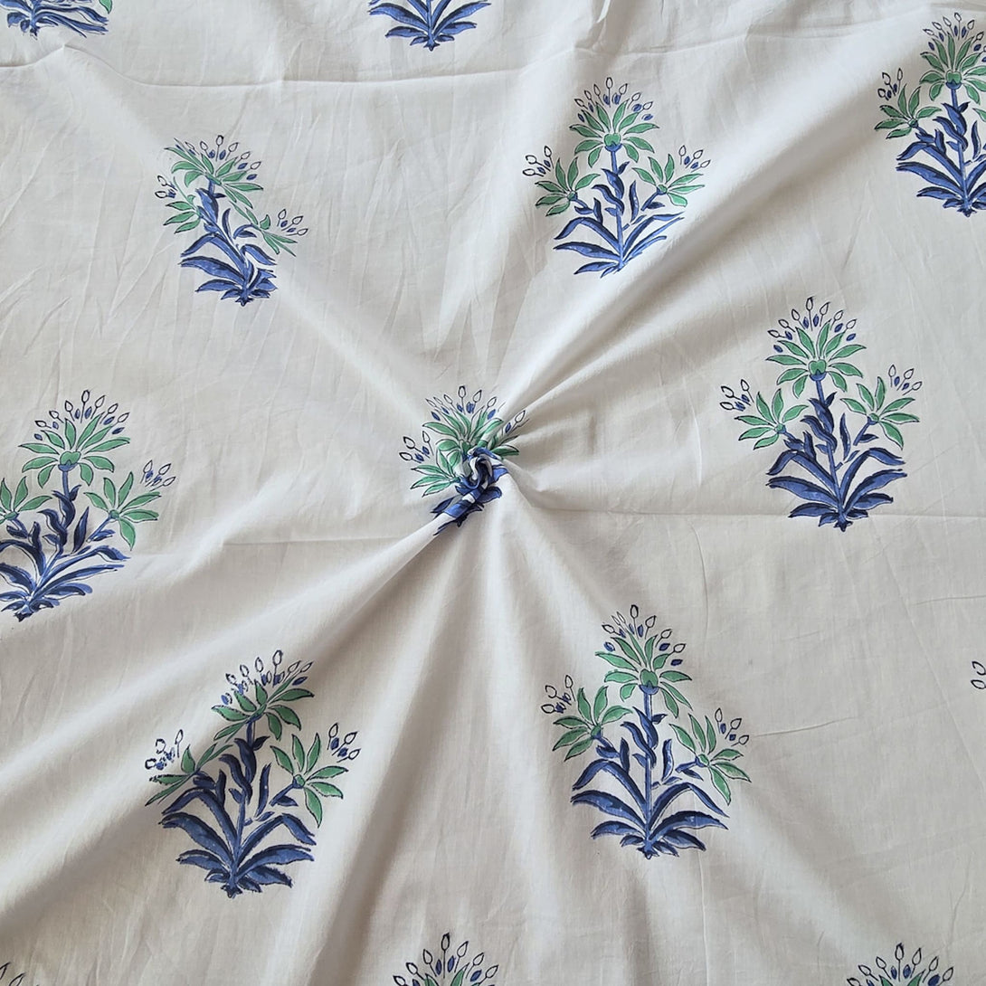 Pure Cotton Jaipuri White With Green Flower Plant Motif Hand Block Print Fabric