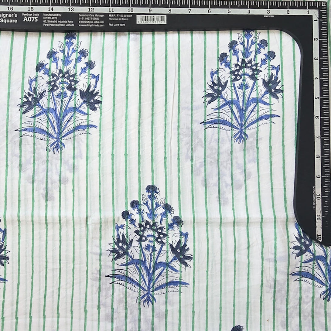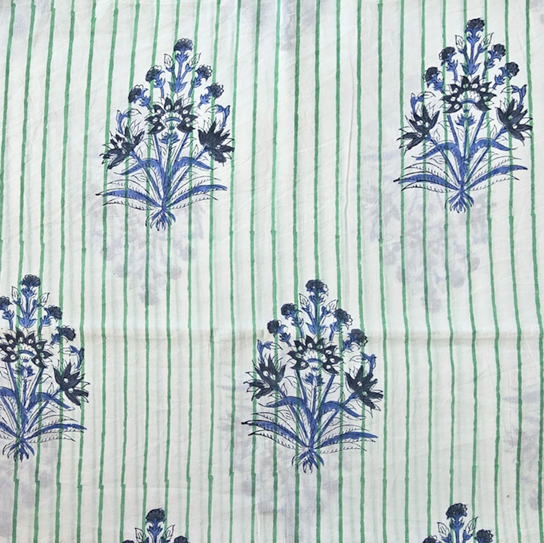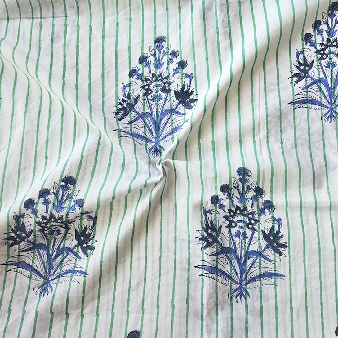 Pure Cotton Jaipuri White With Green Stripes With Plant Motif Hand Block Print Fabric