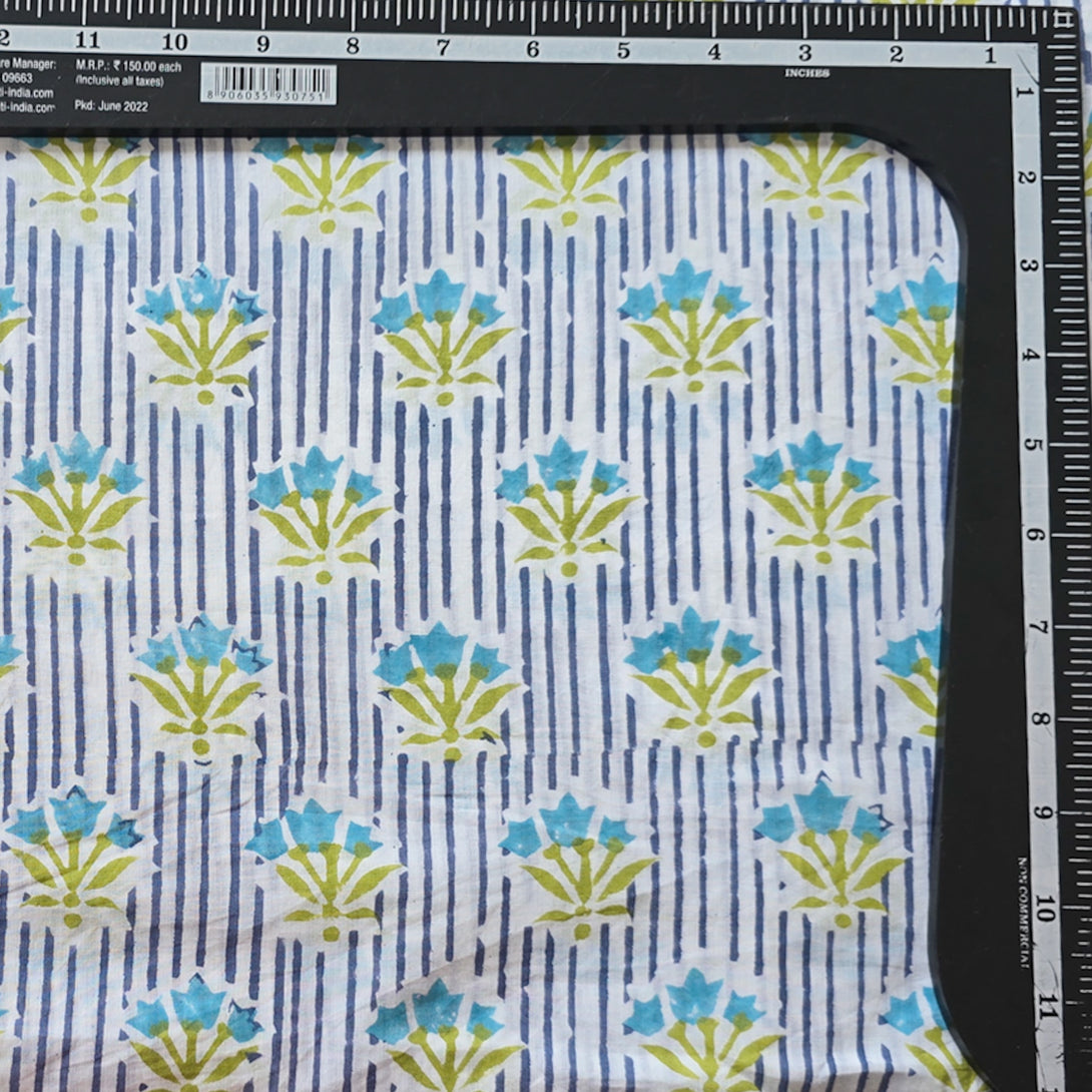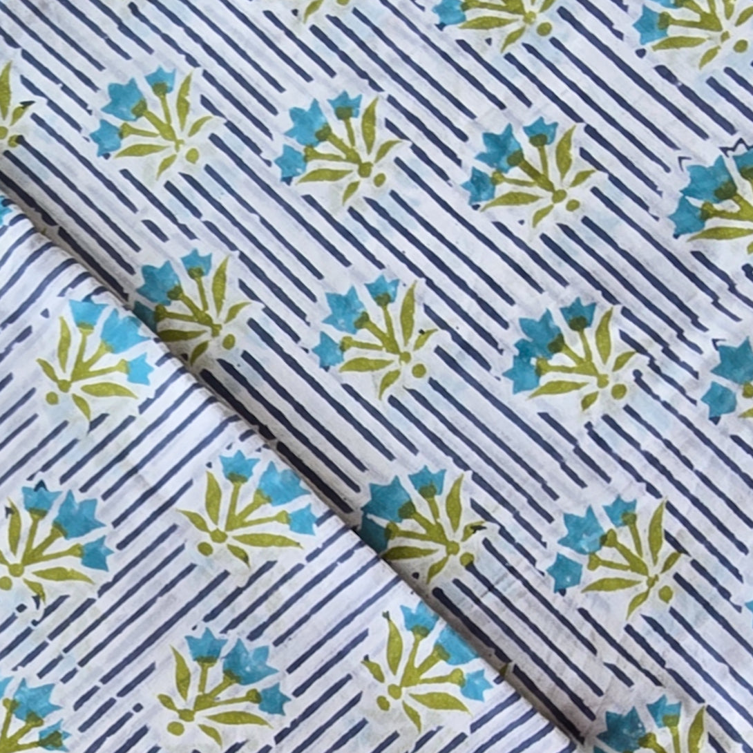 Pure Cotton Jaipuri White With Light Blue and Light Green Flower Motif Hand Block Print Fabric